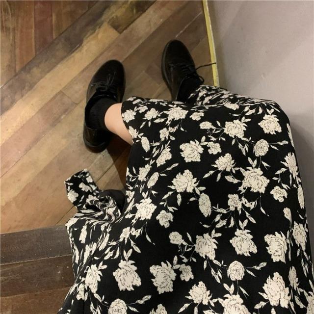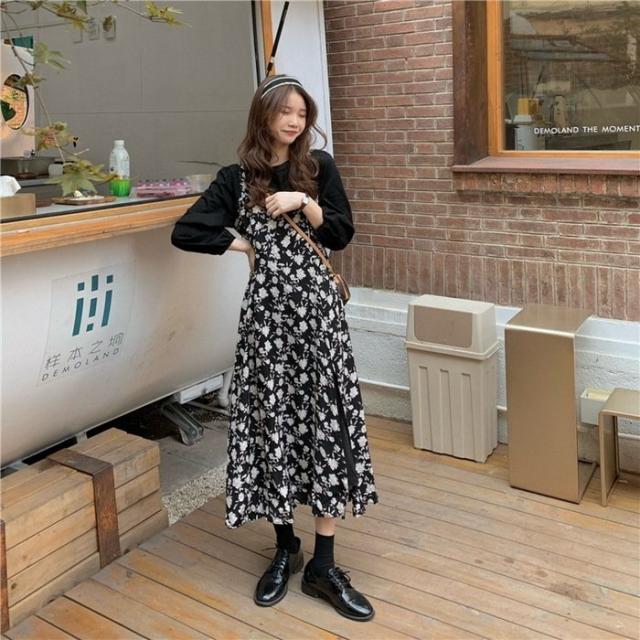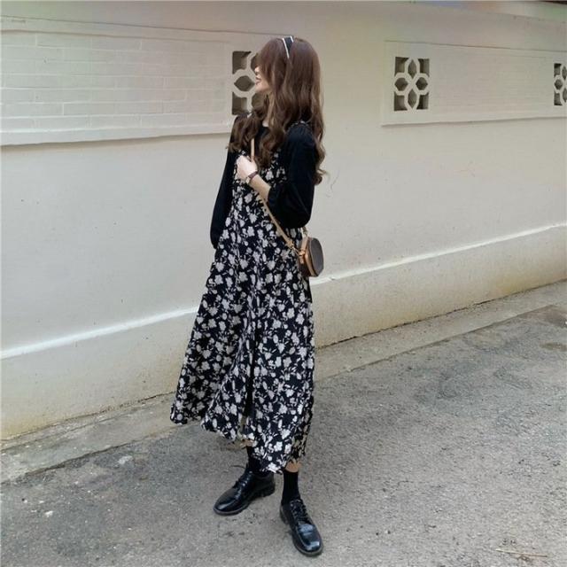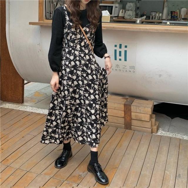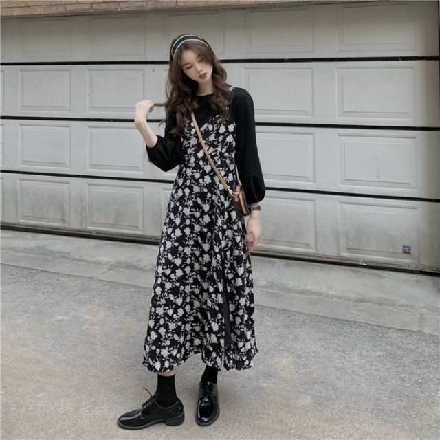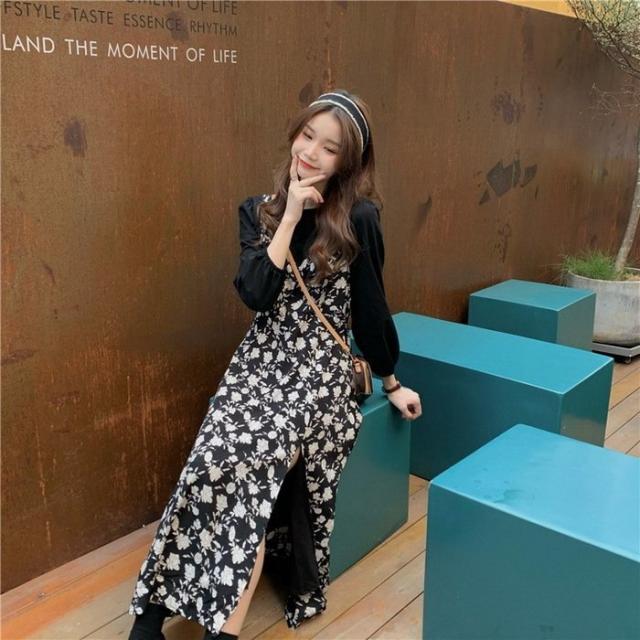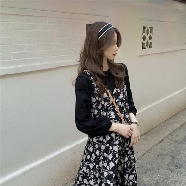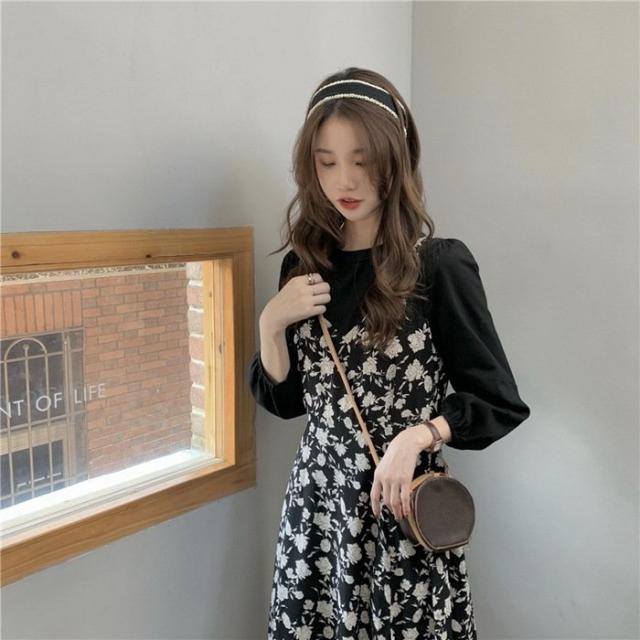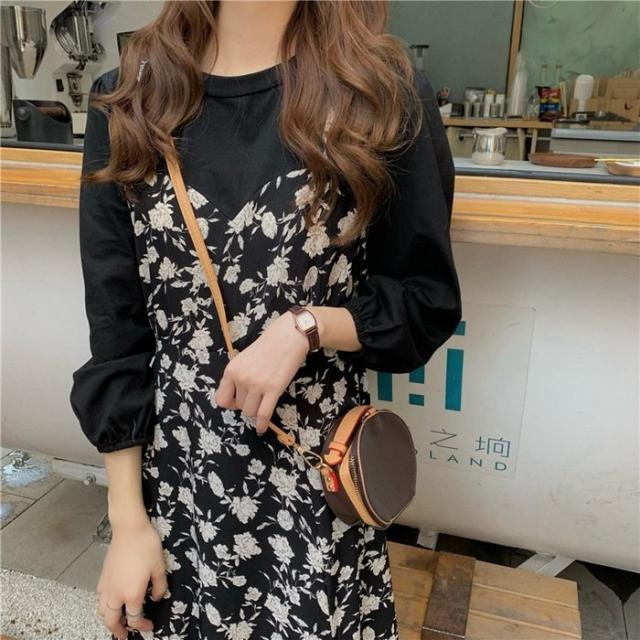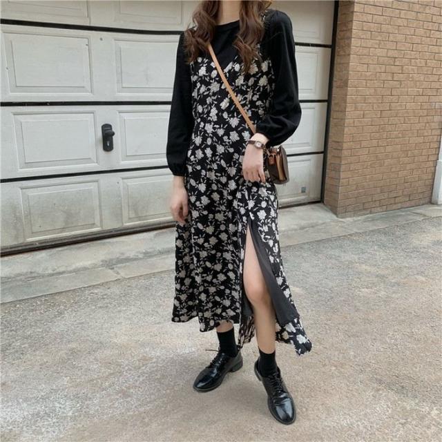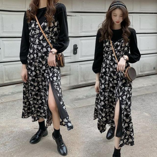 ワンピース レディース 40代 マキシワンピース 春夏 長袖ワンピース 花柄シフォンワンピース フェイクレイヤード オシャレ 韓国風 通勤 お出かけ 大人可愛い