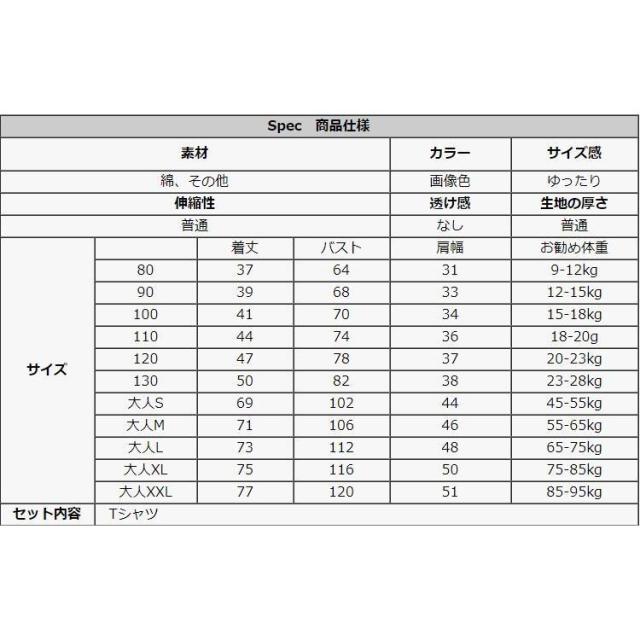 | サイズについての説明 | 商品説明★商品内容:親子服【PR】1.おしゃれな親子ペアルック服!2.家族揃いで幸せ感たっぷり!3.家族旅行、撮影、運動会、お出かけに最高!4.誕生日、記念日、ご家族へ感謝の気持ちとしての贈り物に大人気!5.着心地の良い柔らかいコットンを使用しています。サイズは、実寸を測っているため多少の誤差はございます。実商品とPC画面では、多少見た目の色に違いがございます。※機械による生産のため、生地の継ぎ目に若干のズレや多少のほつれところがありますが、品質上の問題はございません。予めご理解下さいますようお願い致します。 |