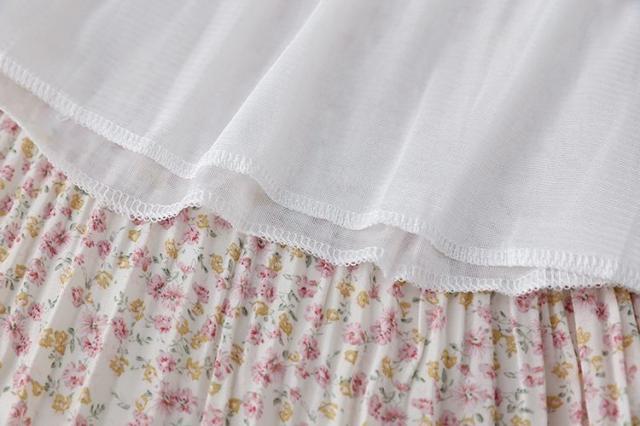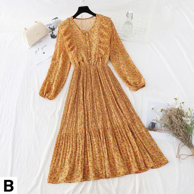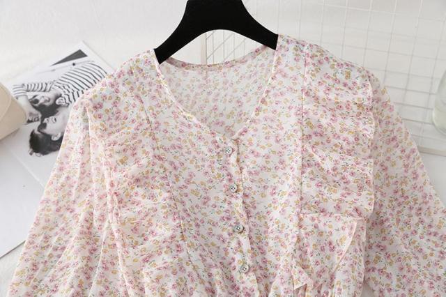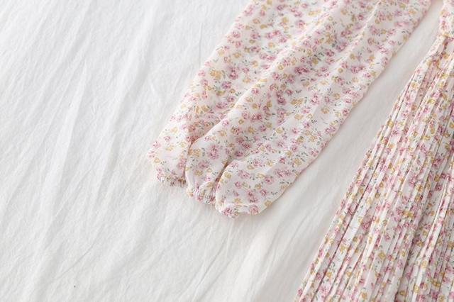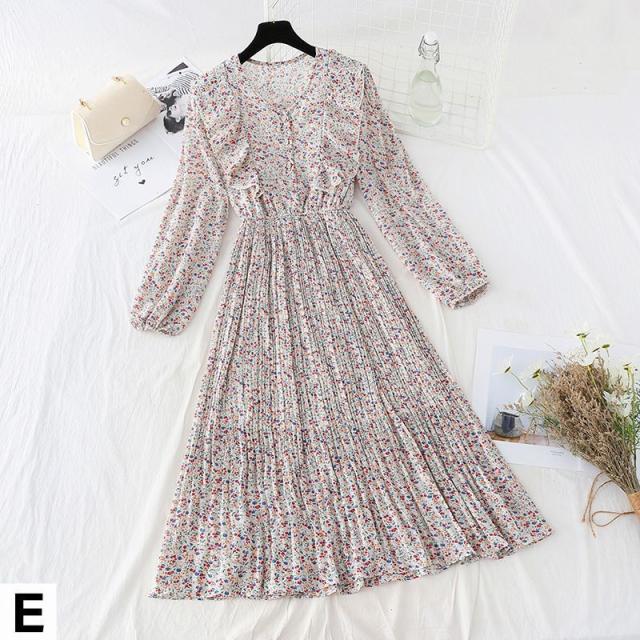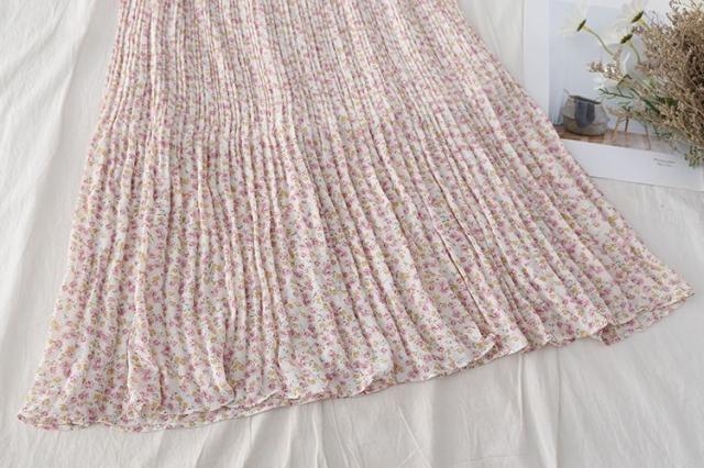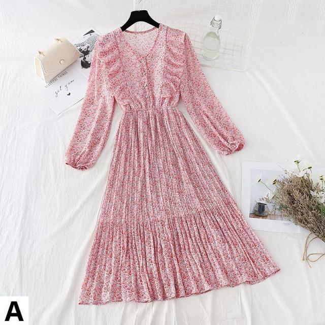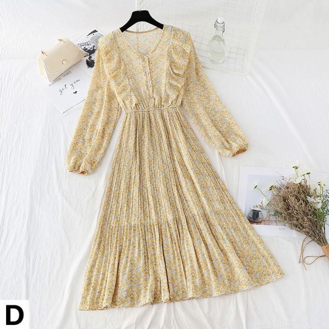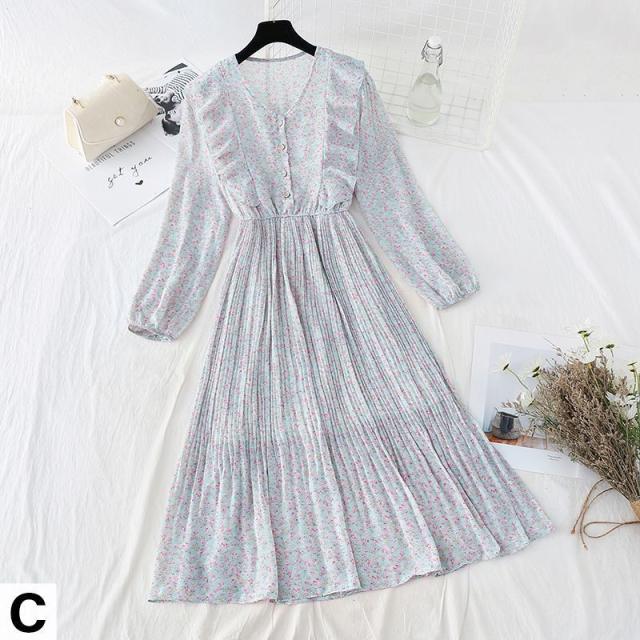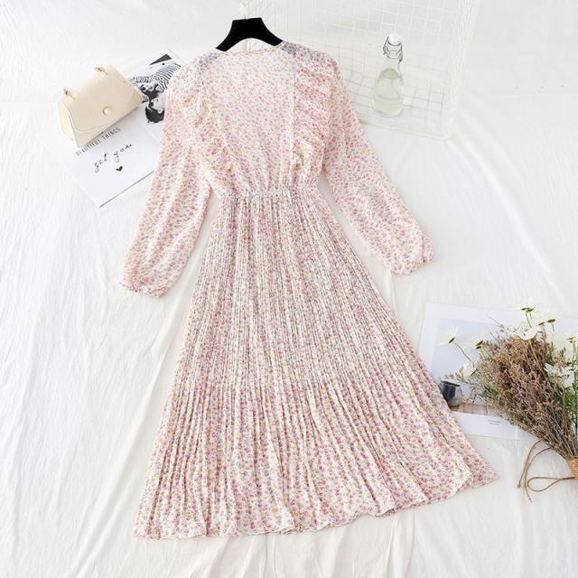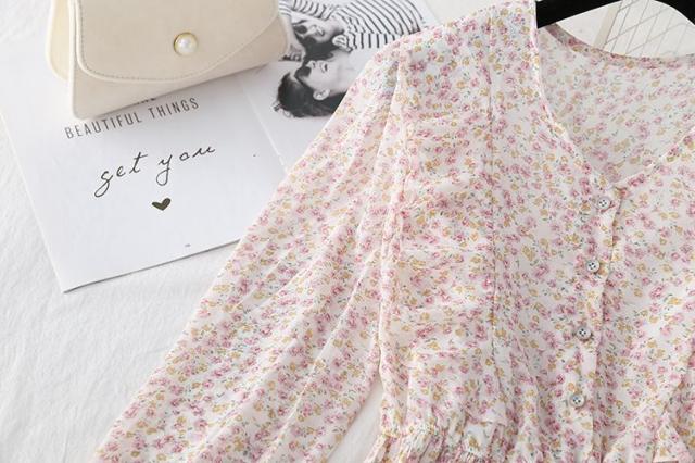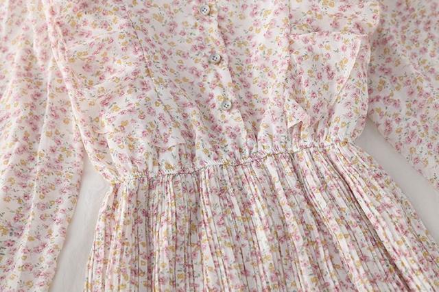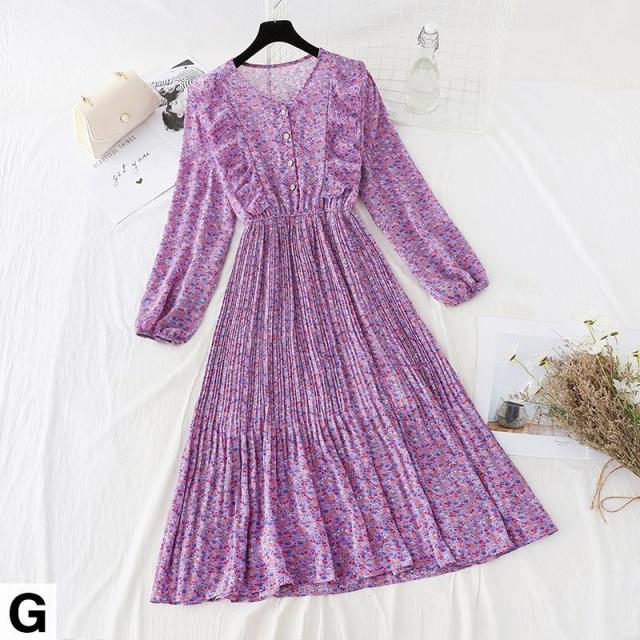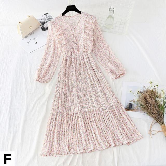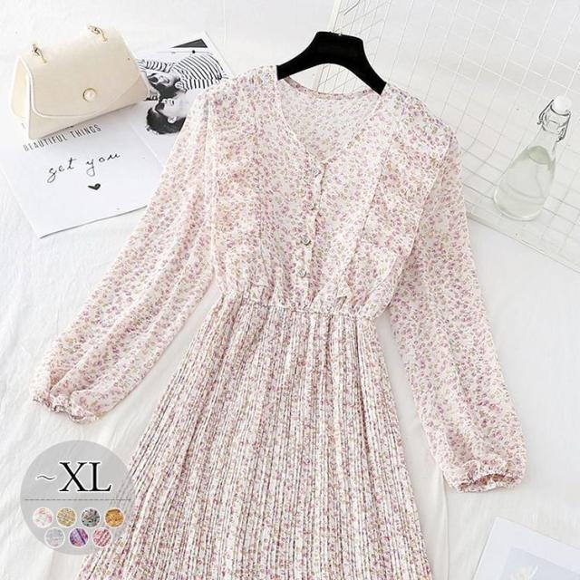 ワンピース Vネック 小花柄 アコーディオンプリーツ フリル フロントボタン 総柄プリント ドライブ ディナー 学校行事 女子旅 大人 /[pie71]