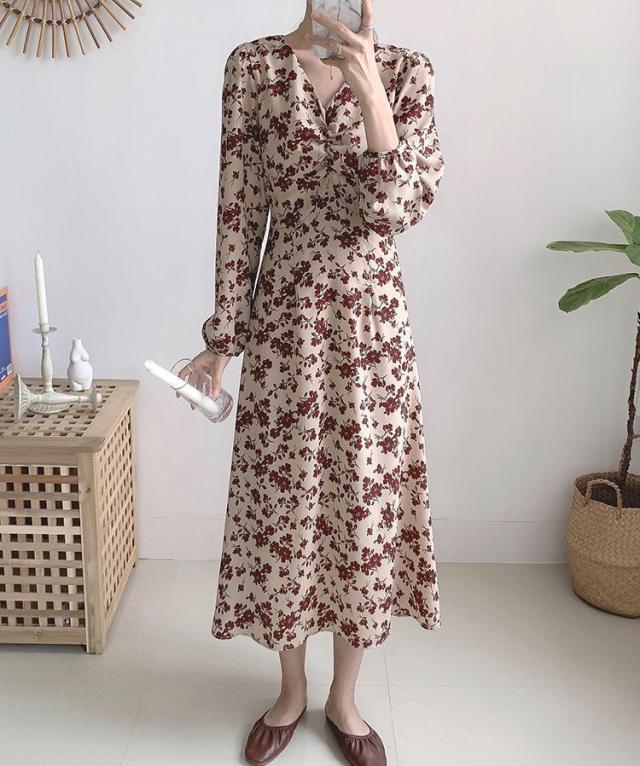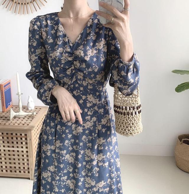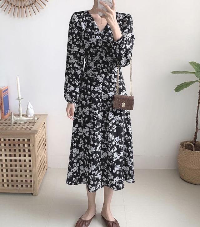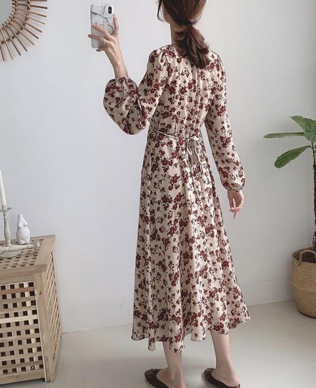 ワンピース 花柄 Vネック Aライン ウエストリボン クラシカル 母親 クール 清楚 女子会 キレイ目 休日スタイル ママスタイル /[pie87]