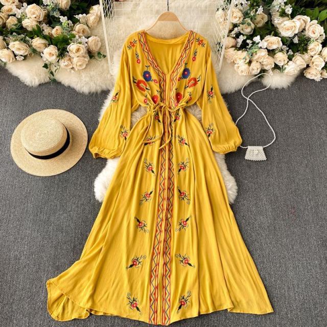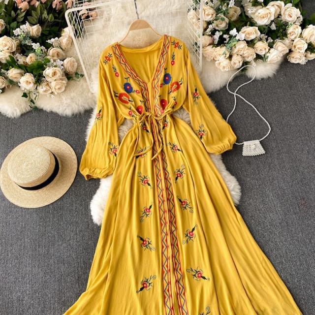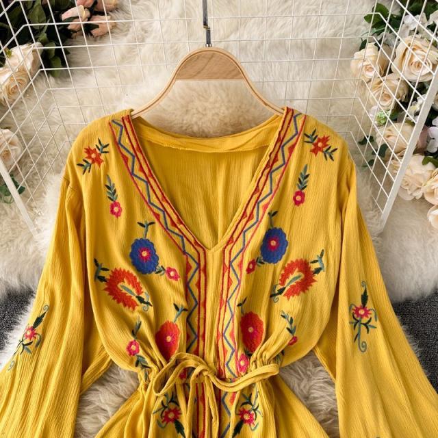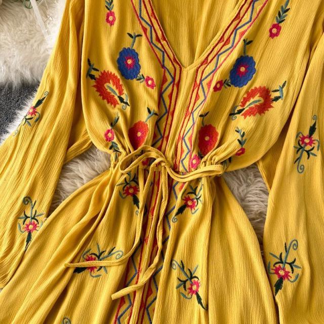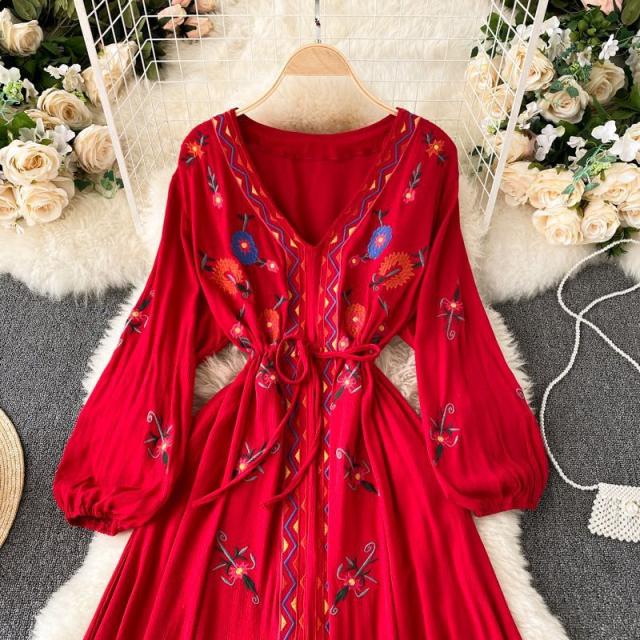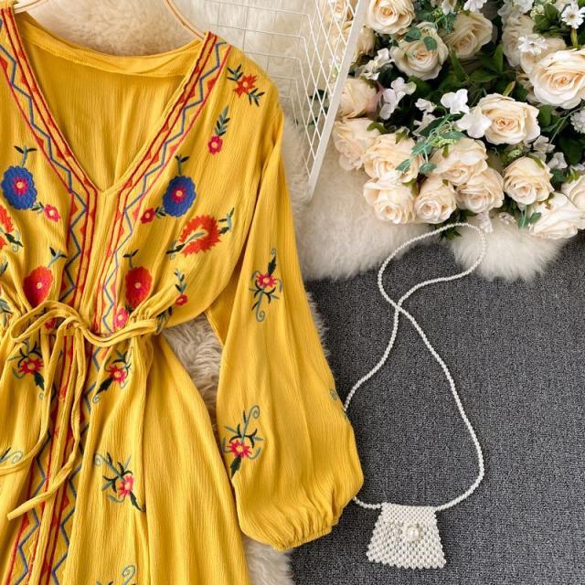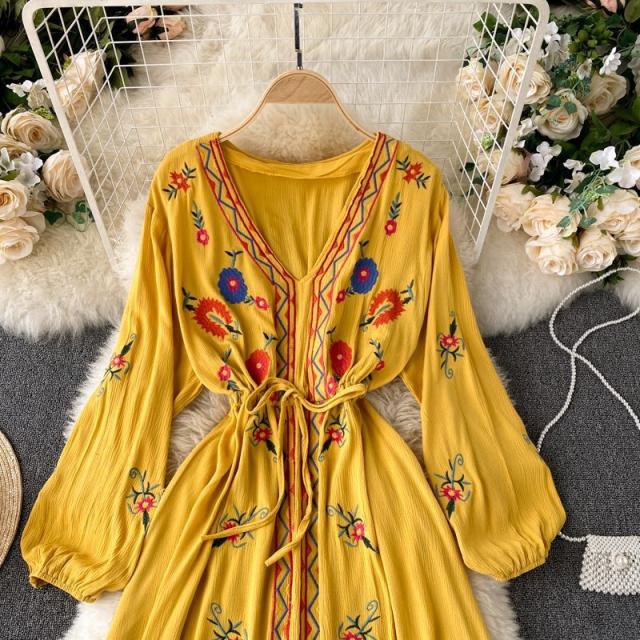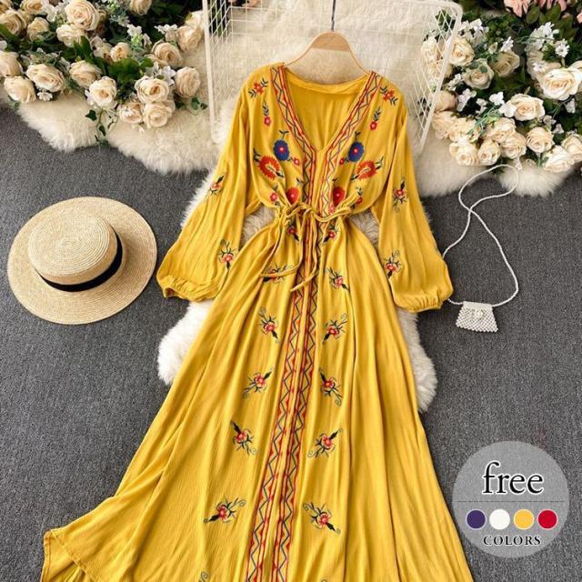 ワンピース 花柄 ウエストリボン 刺繍 エスニックスタイル 2次会 お呼ばれ お出かけ 披露宴 ワインイベント パーティーコーデ 母親 入園式 /[pig22]