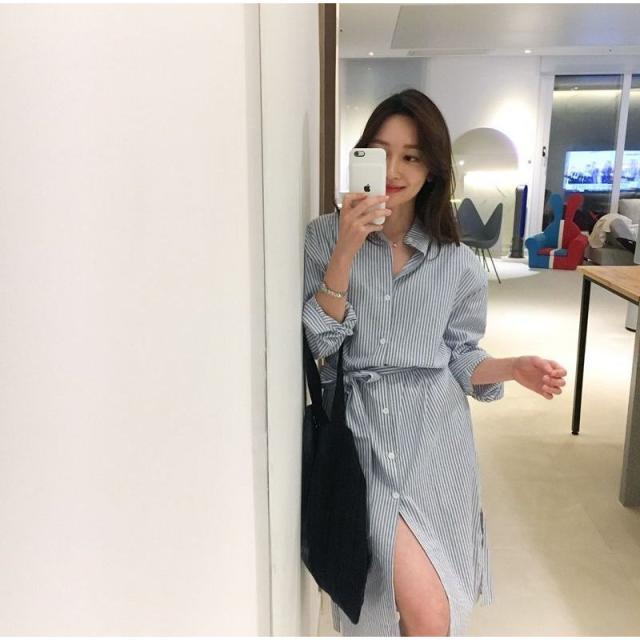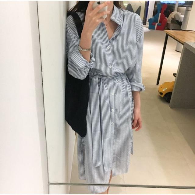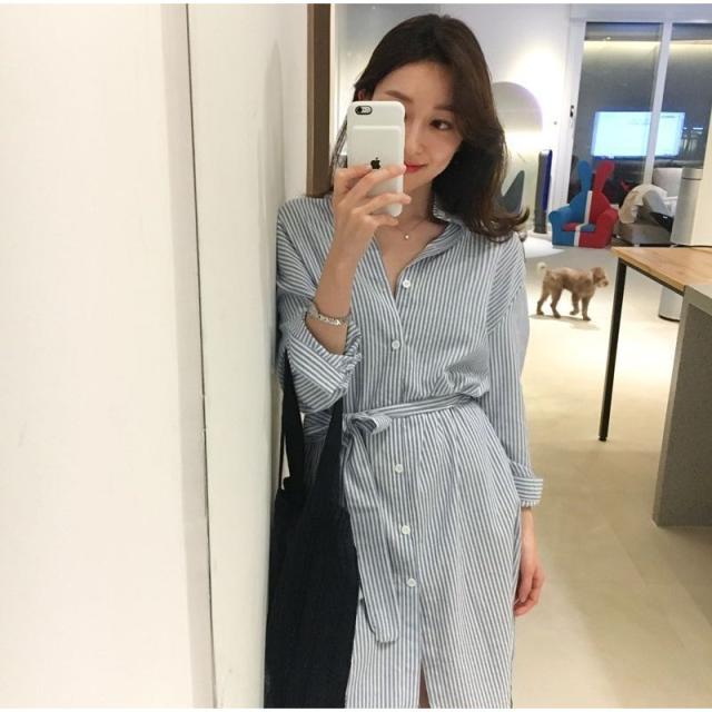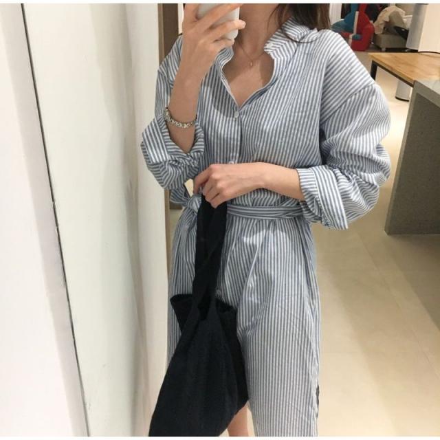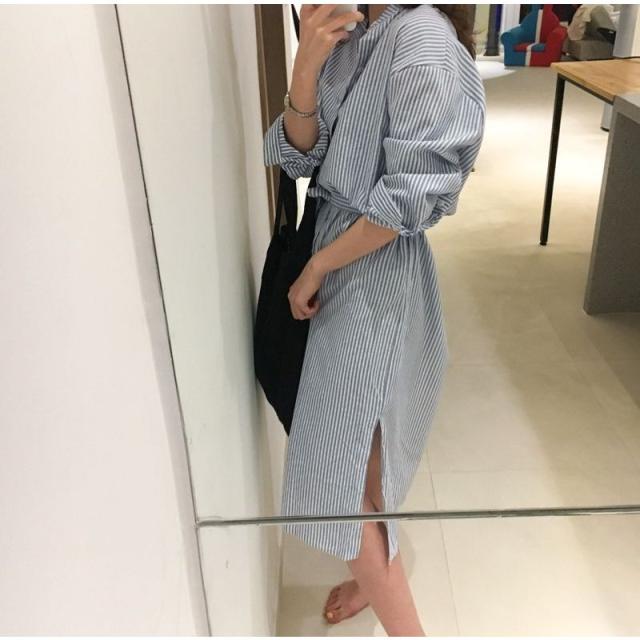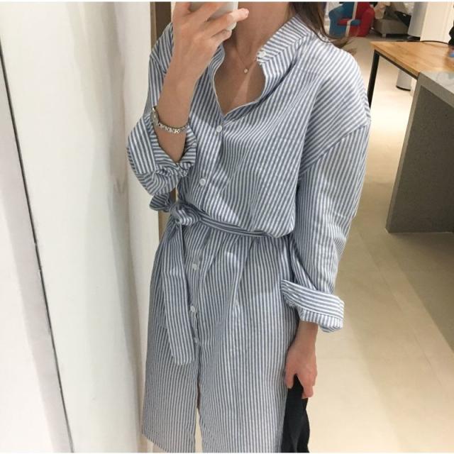 ワンピース レディース Aライン ロング丈 長袖 シャツワンピ バンドカラー スリット ストライプ 縦縞 リボン ウェストマーク