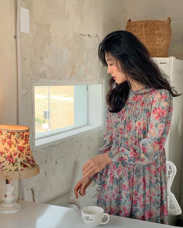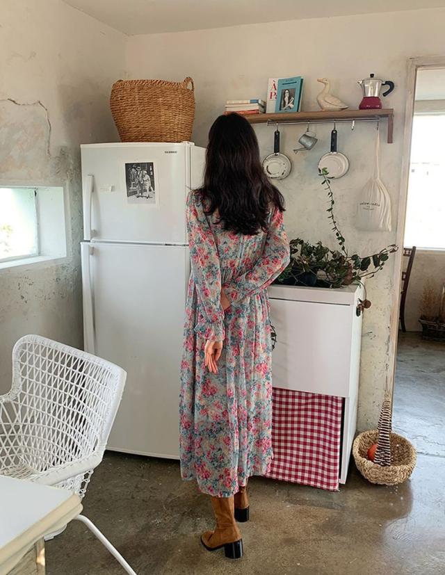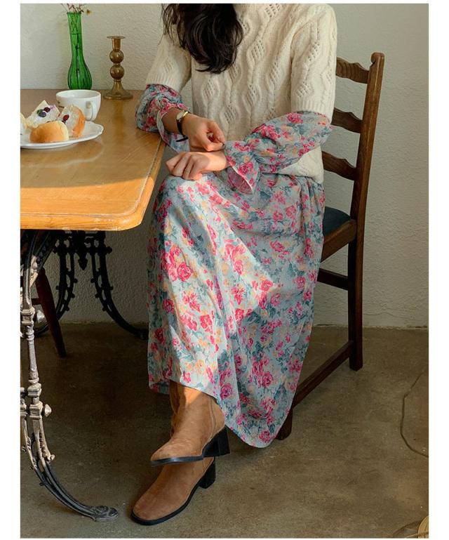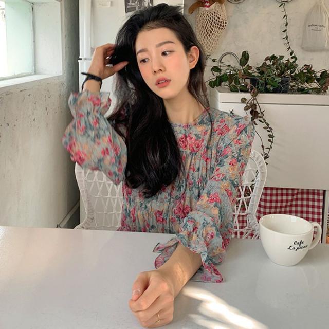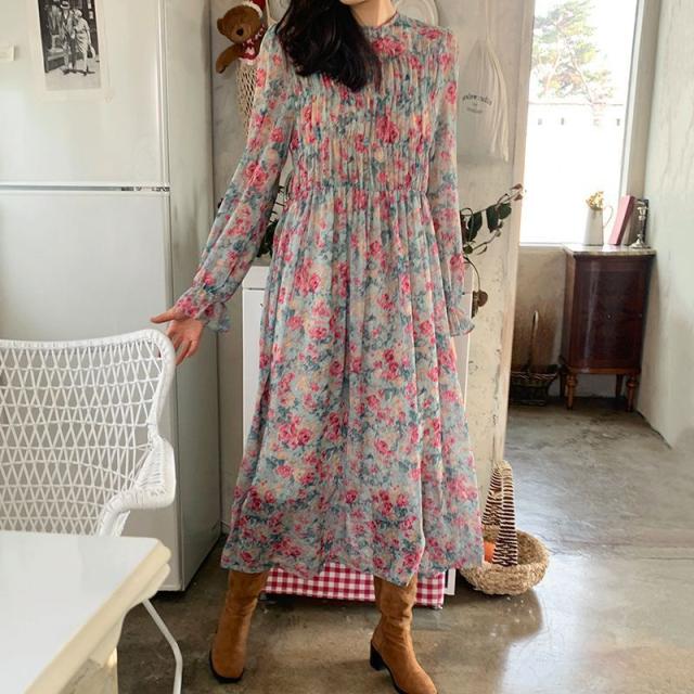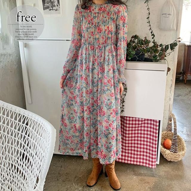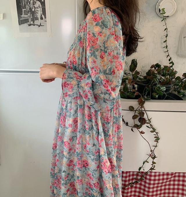 ワンピース ラウンドネック 袖口フレア 小花柄 シフォン ギャザー レトロ ナチュラル 女子旅 ママスタイル きれいめ 清楚 お出かけ 食事会 /[pio71]