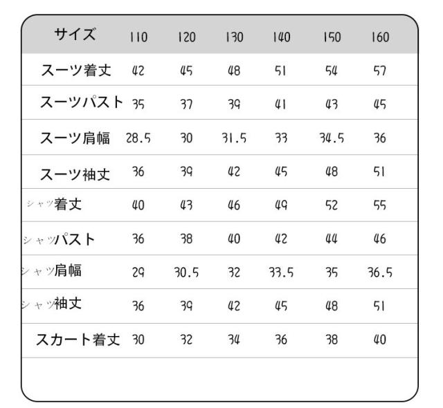 | サイズについての説明 | 子供スーツ フォーマル 子供服 セットアップ キッズ 長袖 春秋 3点セット アウター シャツ スカート 入学式 卒業式 可愛い おしゃれ 通学着 新品●モニター画像は実際の商品と色合いが異なる場合もございます。●平置き実寸採寸のため生地の伸縮性や素材によっては多少の誤差が出る場合がございます。ご了承下さい。 |