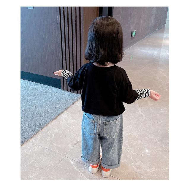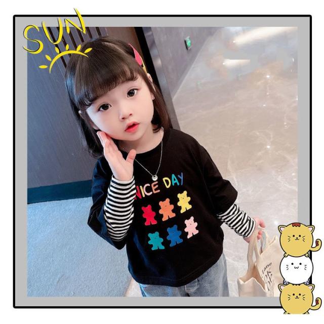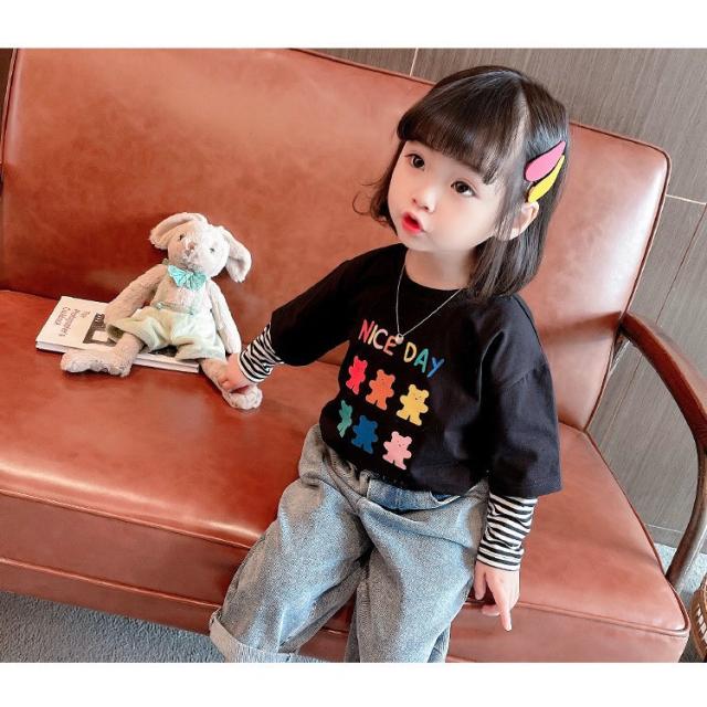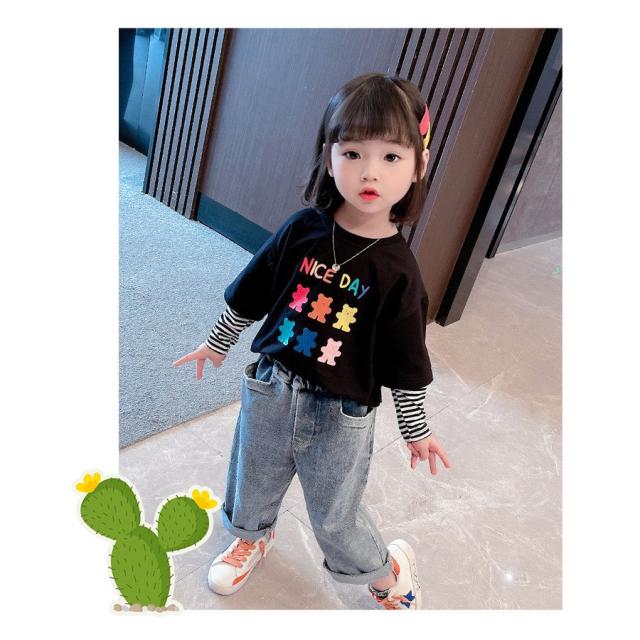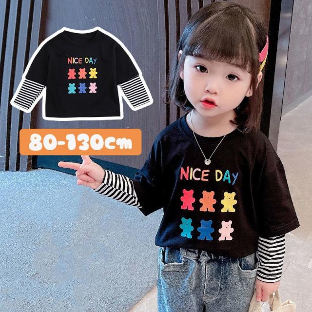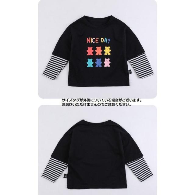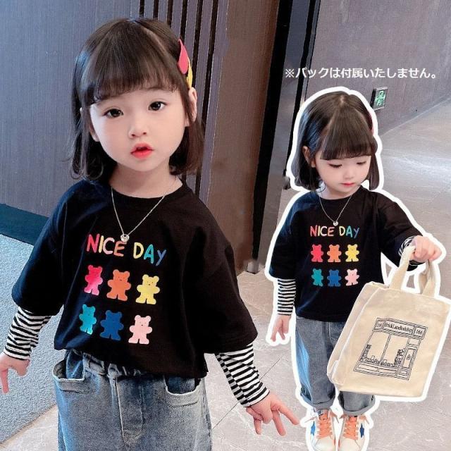 カットソー ロンT トップス 長袖 ラウンドネック キッズ 子供服 女の子 男の子 女児 男児 重ね着風 ボーダー クマ 熊 カラフル プルオーバー