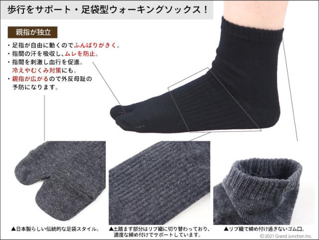■親指が独立している足袋型ソックスは、親指が自由に動かせるので足指で地面をとらえる歩き方ができます。 それによって指が鍛えられるので外反母趾の予防や、疲れにくい正しい歩行がしやすくなるといった効果があります。