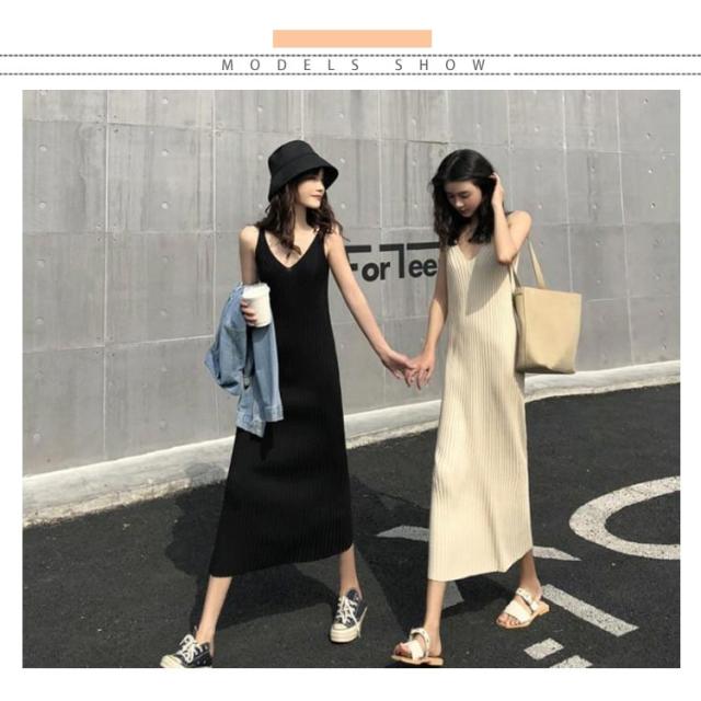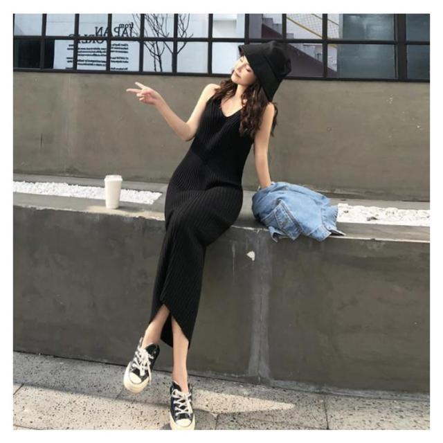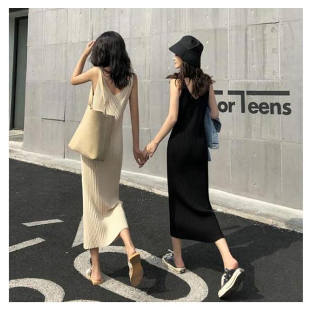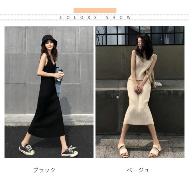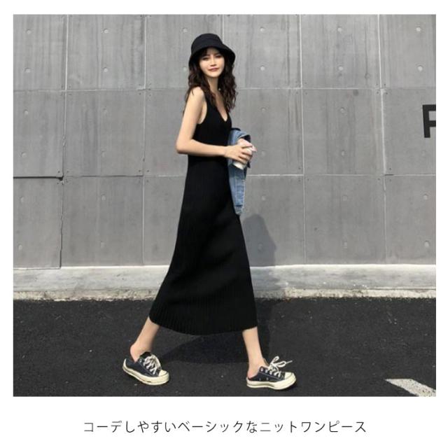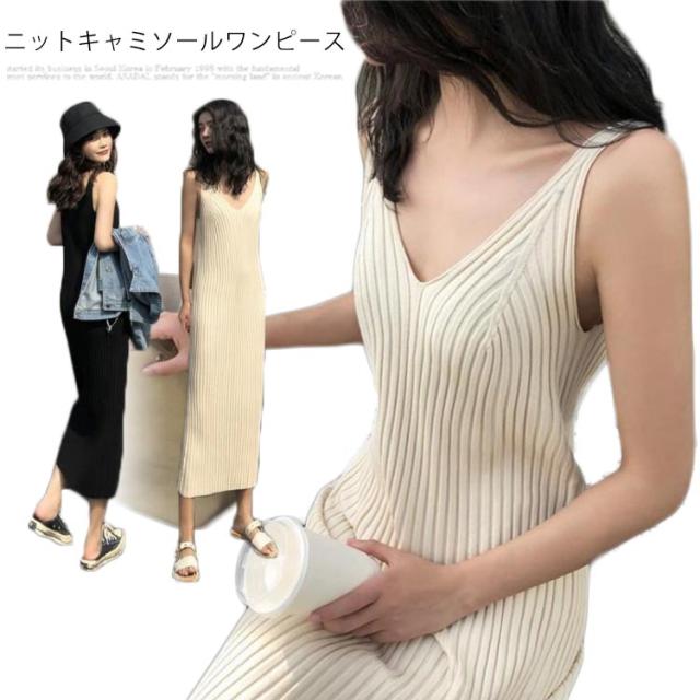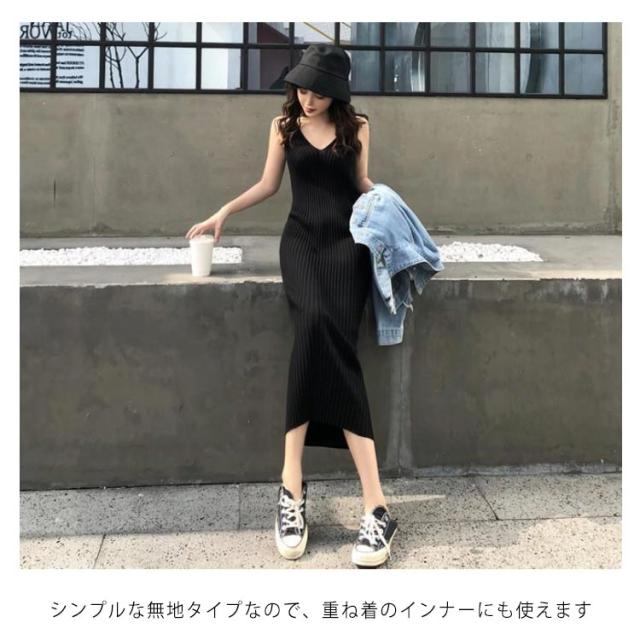 ニットワンピース ワンピース レディース キャミソールワンピース ロングワンピース ミモレワンピース ノースリーブ キャミワンピ Vネック リブニット リブ編み 送料無料 無地 ストレッチ お洒落 シンプル カジュアル インナー 春 夏