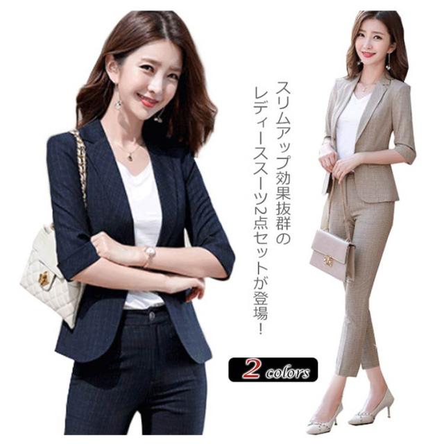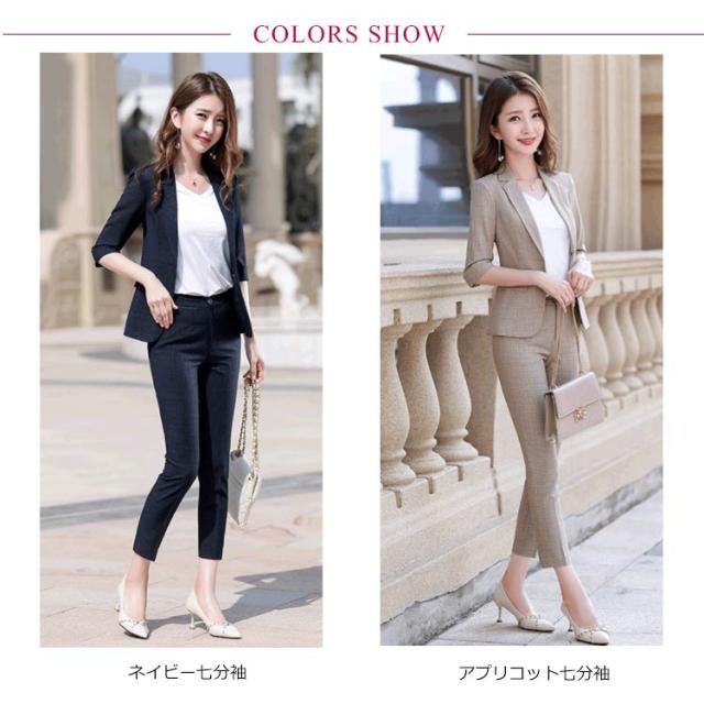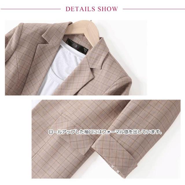 パンツスーツ レディース チェック柄 スーツセット ジャケット パンツ 2点セット 七分袖 七分丈パンツ セットアップ ビジネススーツ フォーマルスーツ ストレッチ 大きいサイズ 上品