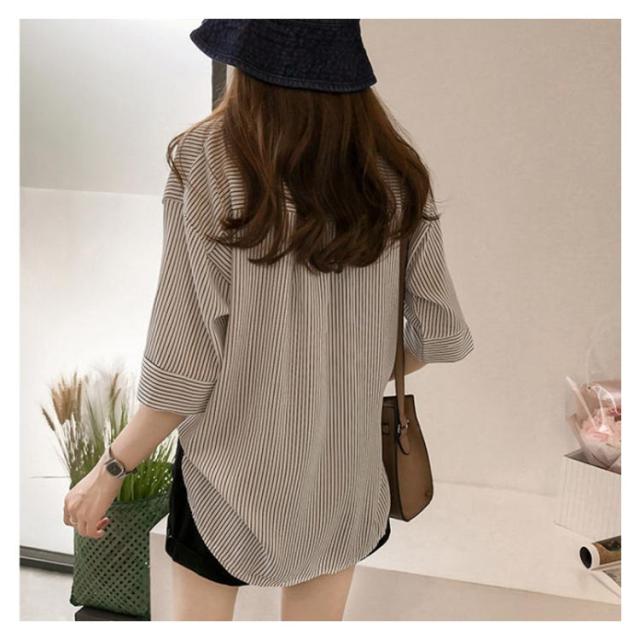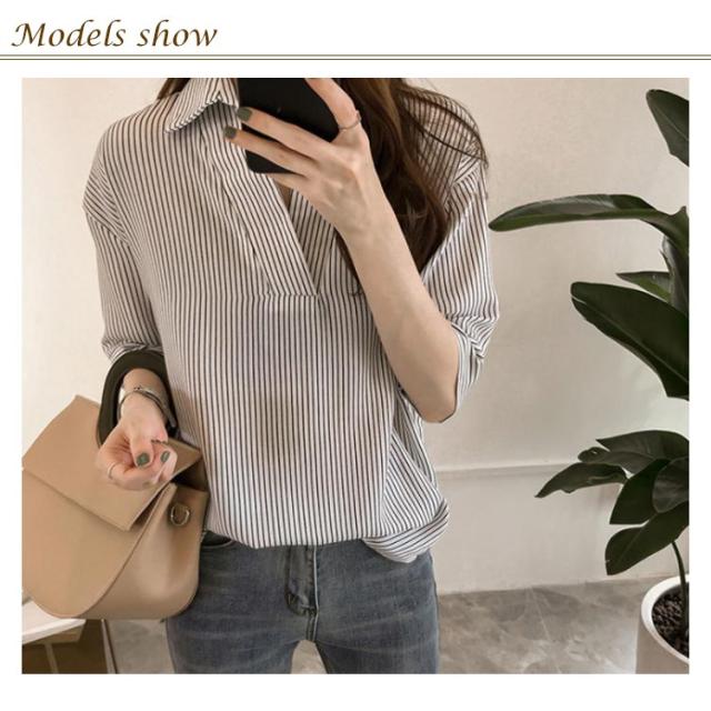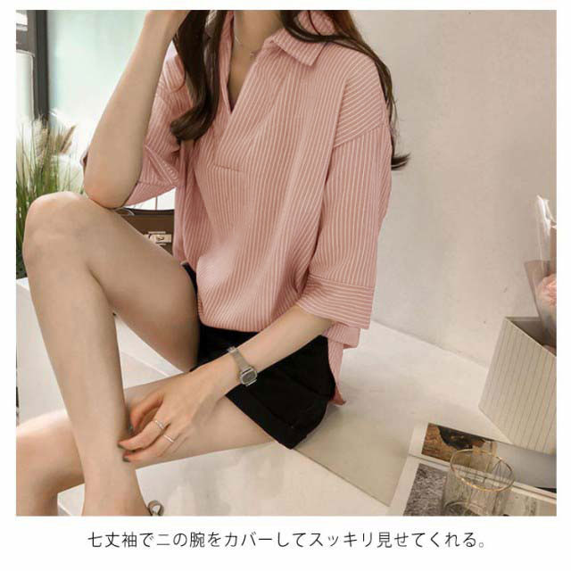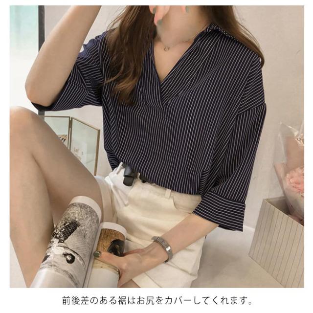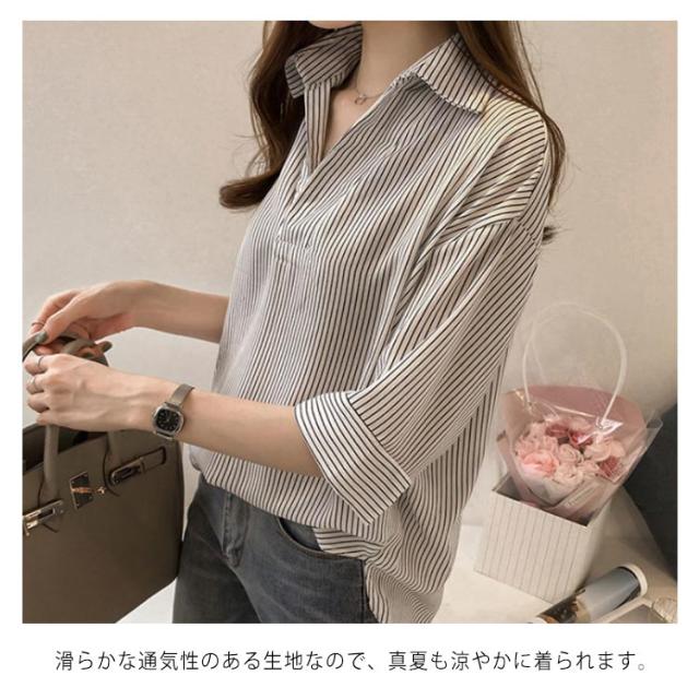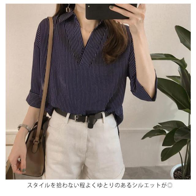 シャツ レディース 七分袖シャツ スキッパーシャツ Vネック スキッパー襟 ストライプ トップス 前後差 薄手 シャツ ゆったり 大人 可愛い 大きいサイズ おしゃれ きれいめ ナチュラル カジュアル オフィス フォーマル OL 春 夏 送料無料