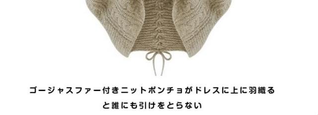 | 柔らかいフェイクファーが華奢な印象!ゴージャスファー付きニットポンチョがドレスに上に羽織ると誰にも引けをとらないスキニーやデニムパンツとの相性もGOOD!デイリー使いとしても大活躍に間違いなしゆったりシルエットがラフに着こなし◎ | |