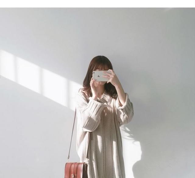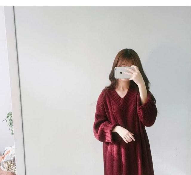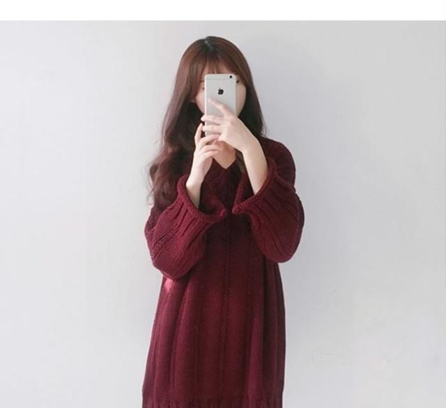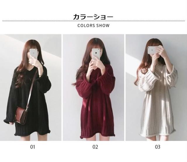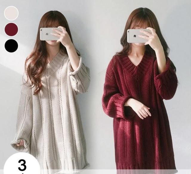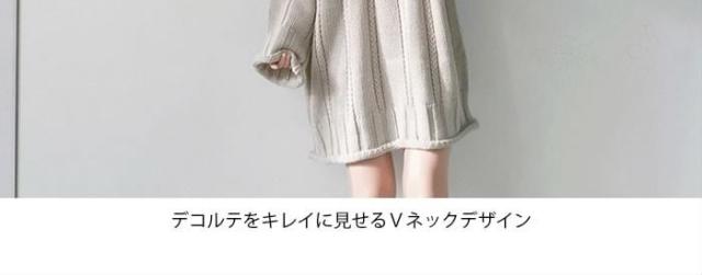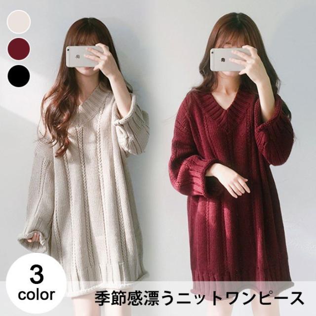 送料無料レディースニットワンピースプルオーバー長袖ニットミニワンピースゆるニットVネックトップスケーブル編み 大人カジュアル