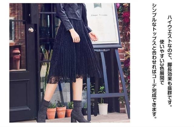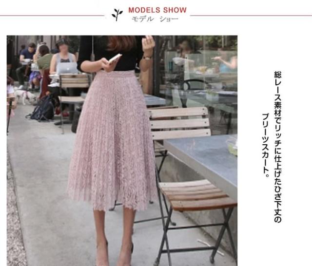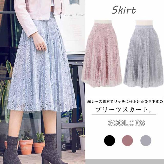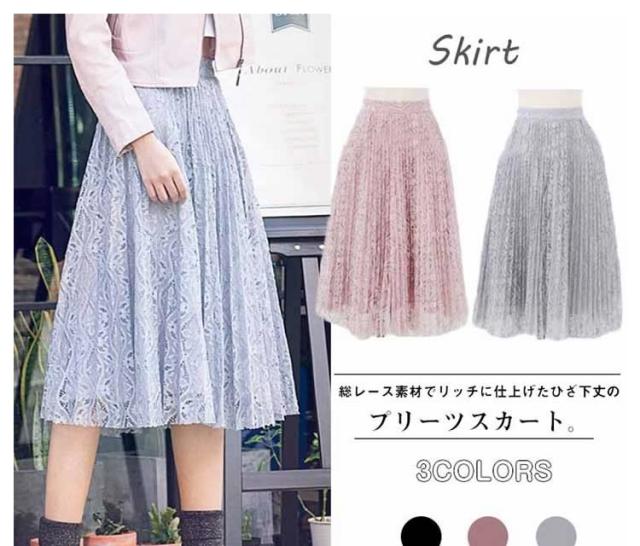 プリーツスカート レース素材 無地スカート ひざ丈 膝丈 ミディ丈 総レース
