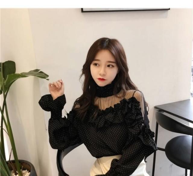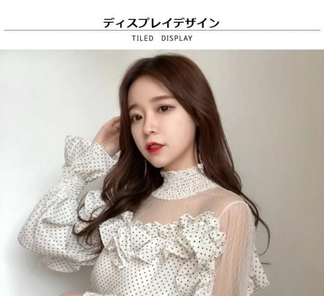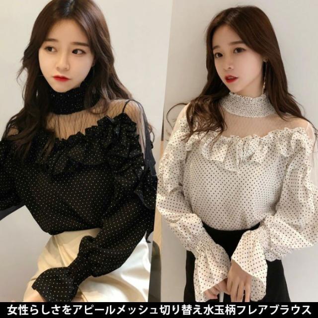 送料無料レディースブラウス長袖水玉柄フリルボリュームスリーブメッシュハイネック透け感フレアブラウスこなれ感キレイめセクシーエレガ