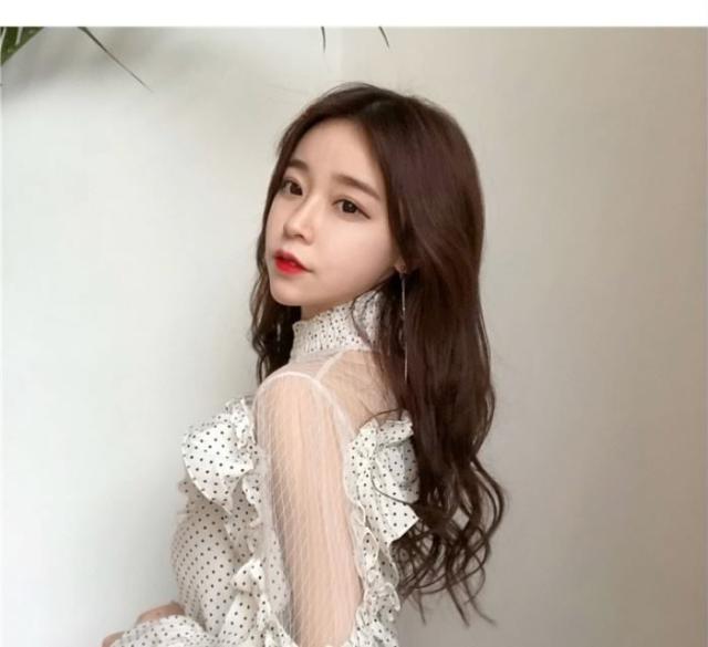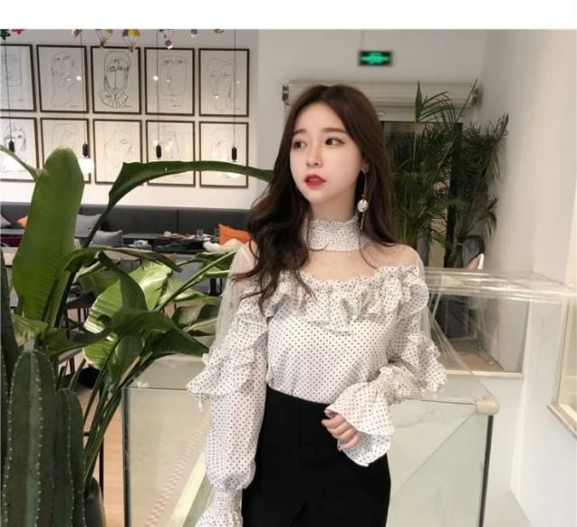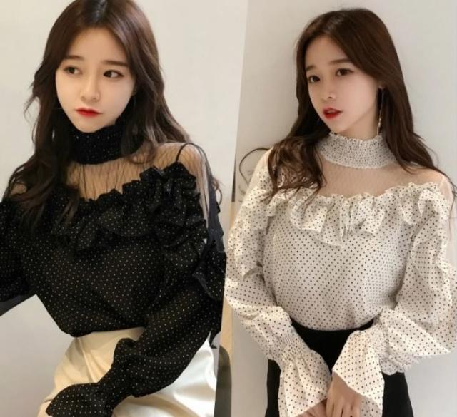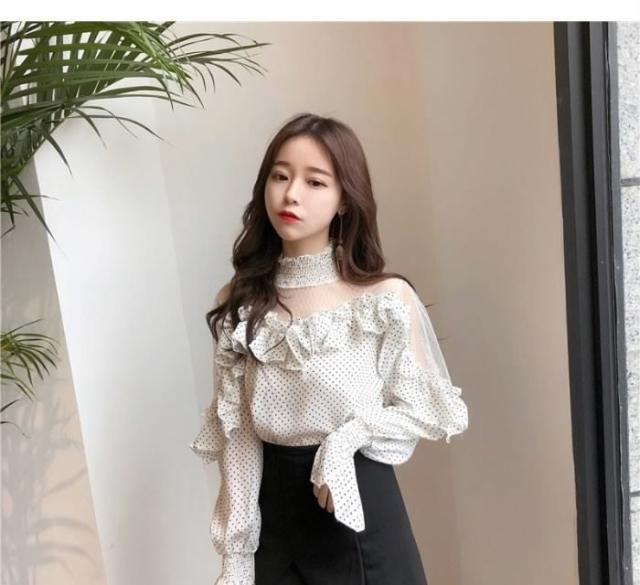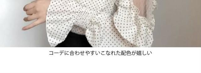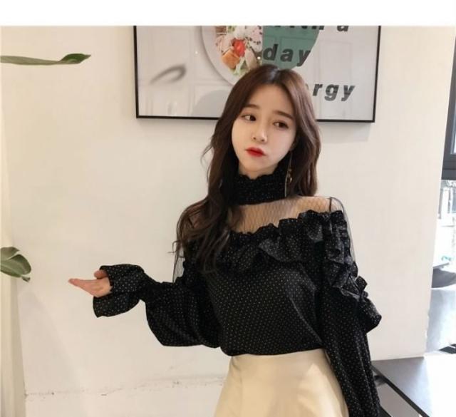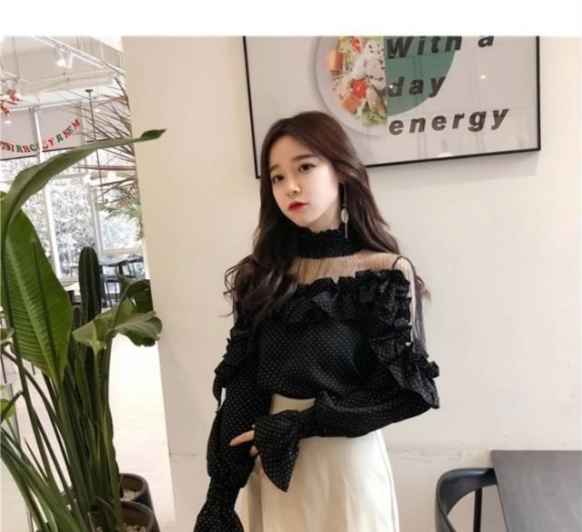 女性らしさをアピールメッシュ切り替え水玉柄フレアブラウス