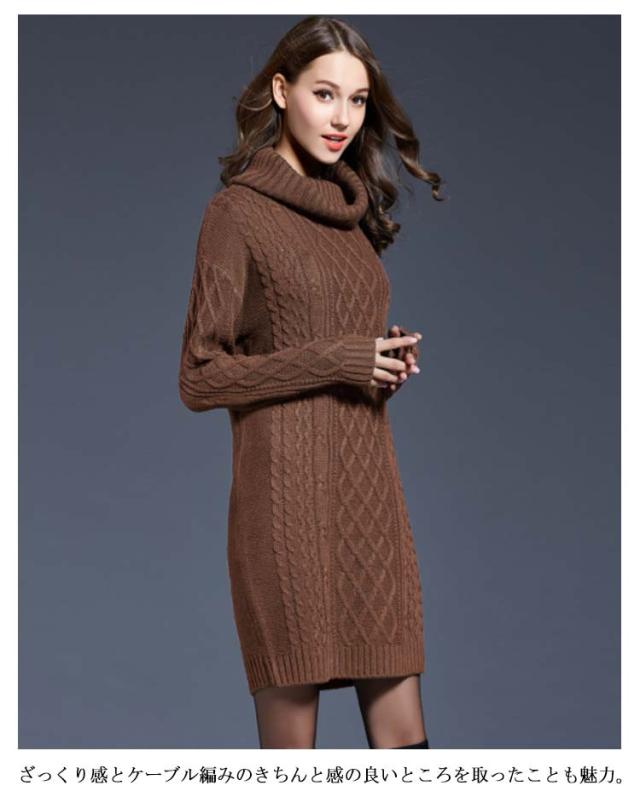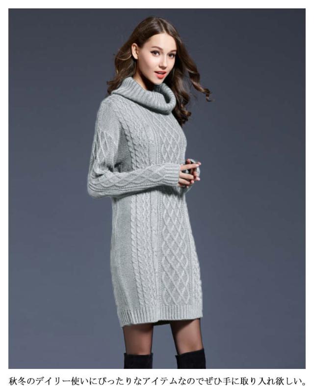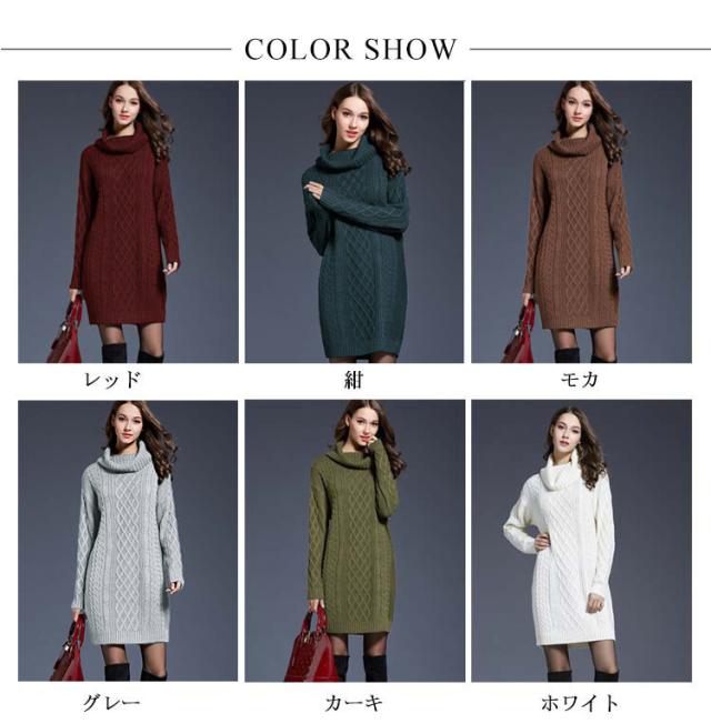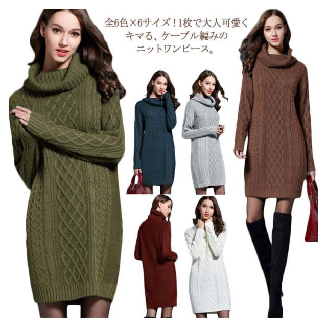 全6色×6サイズ!オフタートルニットワンピース ケーブル編み ロングニット ニットワンピース チュニック ニット セーター ロン