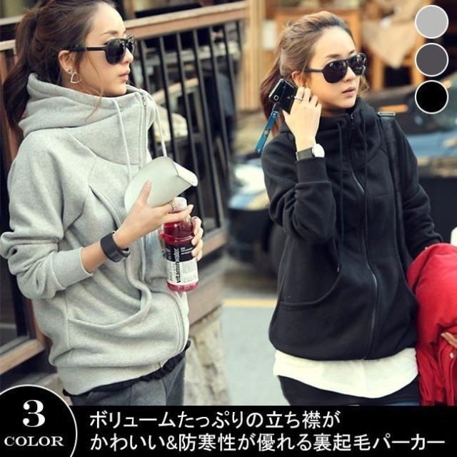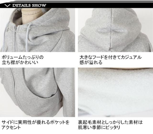 ジップアップパーカー レディース ボリューム襟パーカー 裏起毛パーカー 長袖パーカー カジュアルパーカー 無地パーカー 秋冬パーカー 2017春