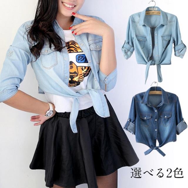 マキシワンピにもパンツにもスカートにも相性抜群!前結び デニムシャツ レディース デニム シャツ 前縛り ショート丈 トップス ロー