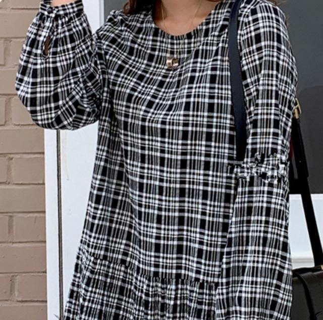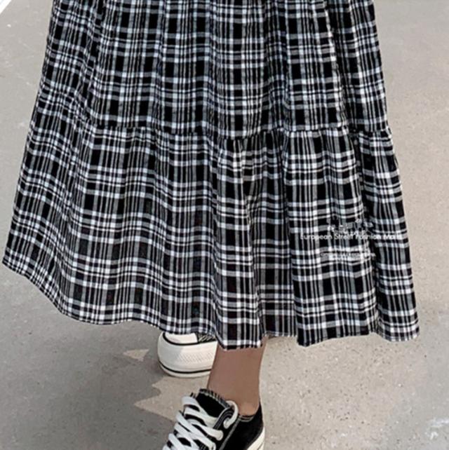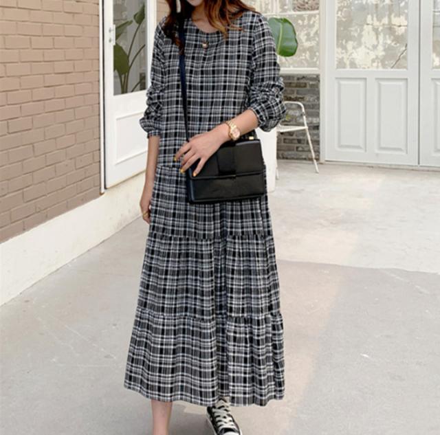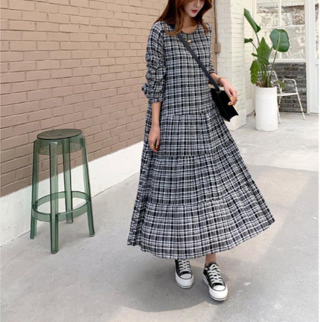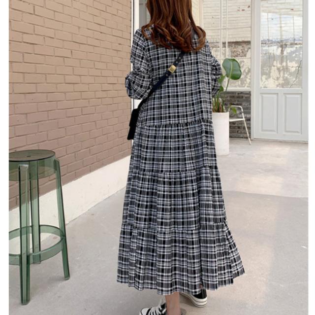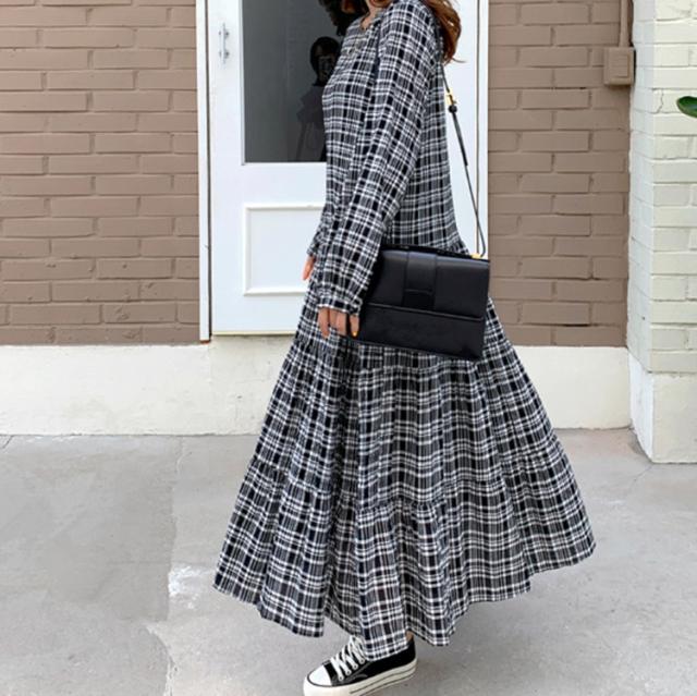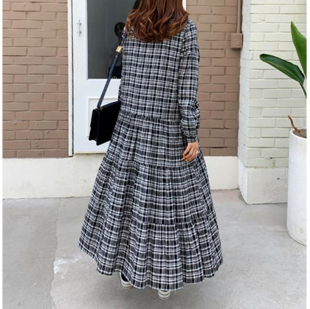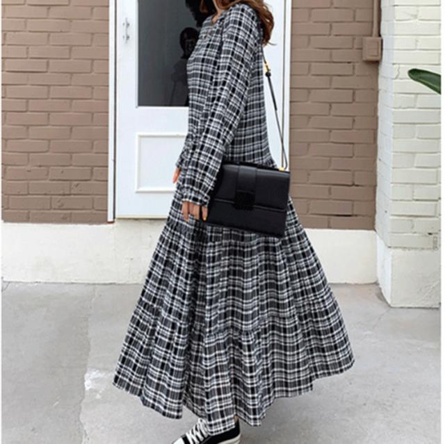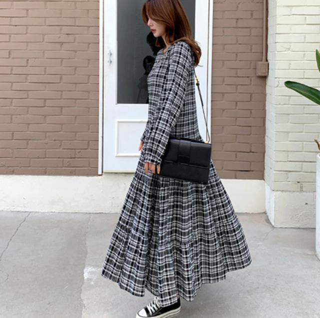 ワンピース レディース 40代 マキシワンピース 秋冬新作 長袖ワンピース 韓国風 チェック柄ワンピース プリーツスカート オシャレ 大きいサイズ カジュアル