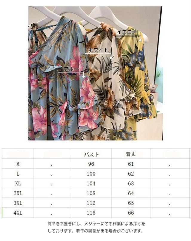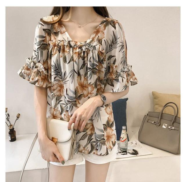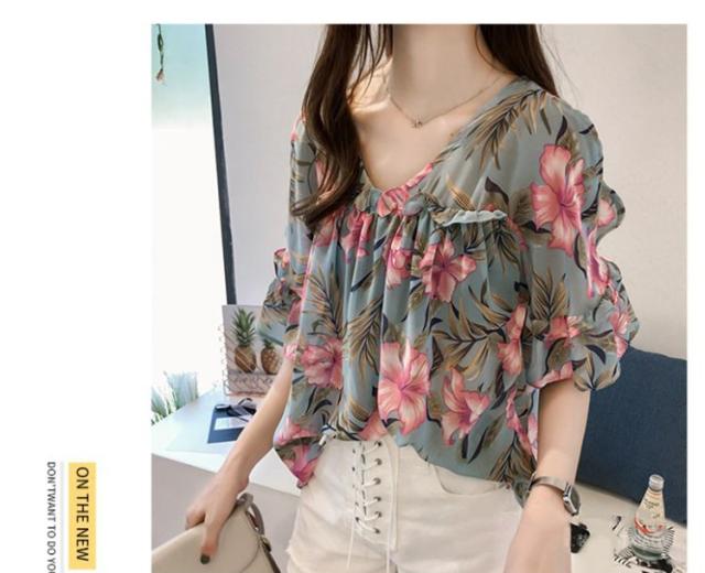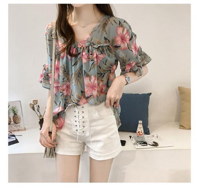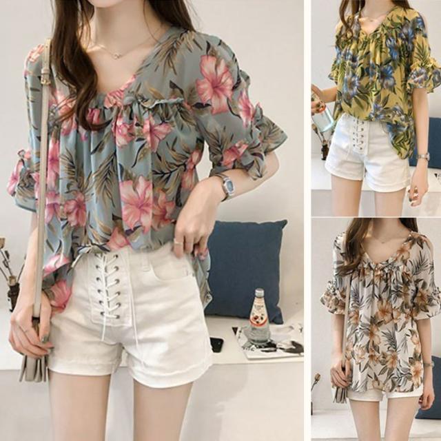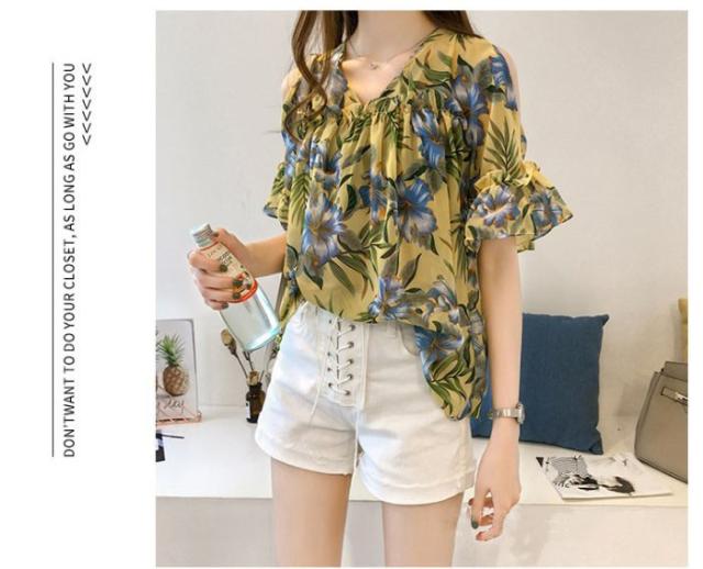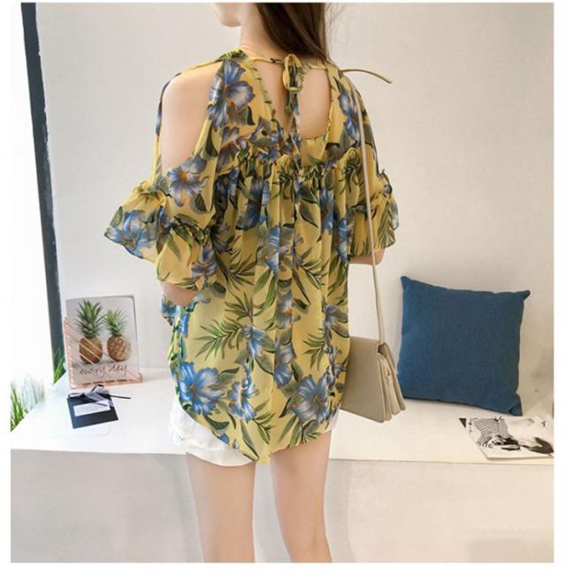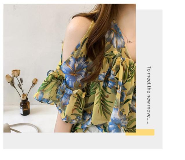 ブラウス トップス レディース オシャレ ブラウス 春夏 半袖 ブラウス 肩出しフリル 花柄 シフォンブラウス パフスリープ 韓国風 トップス 通勤 新作 3色