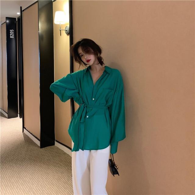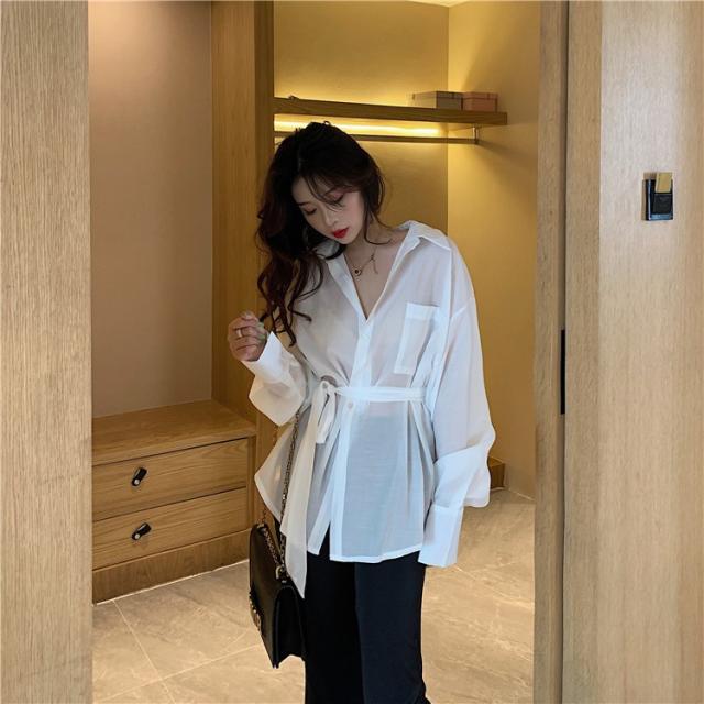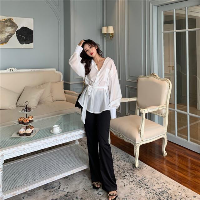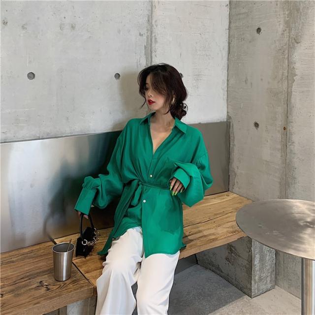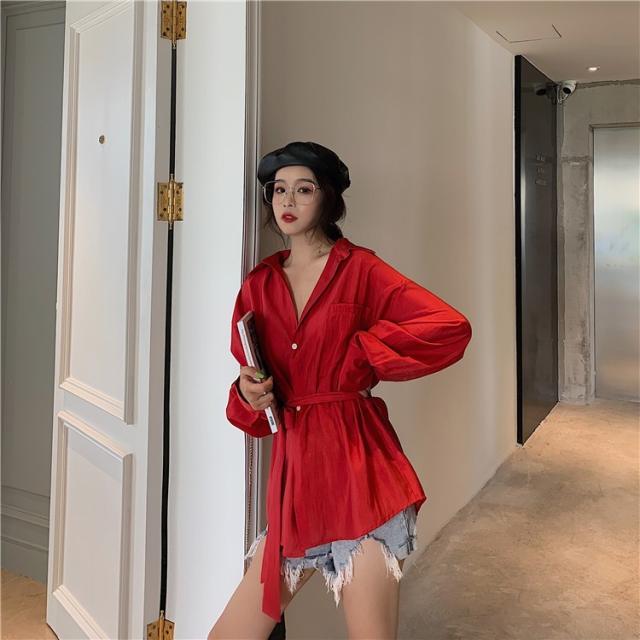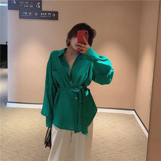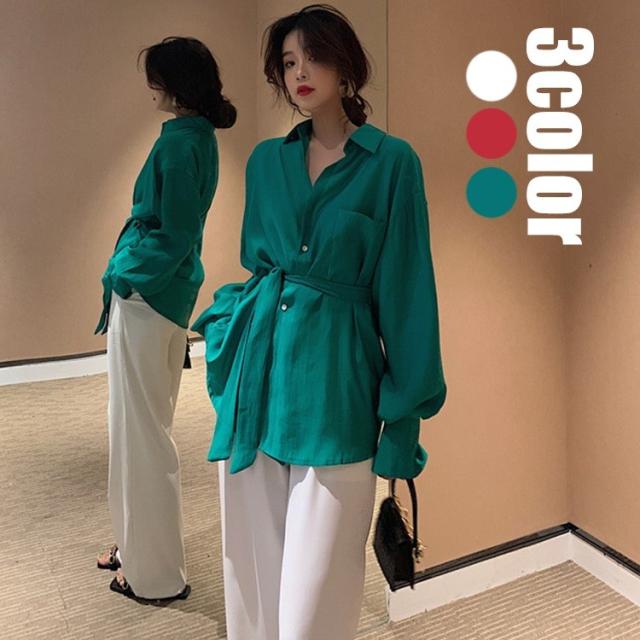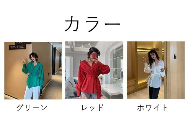 ブラウス レディース 春秋 長袖 Vネック 韓国風 オフィス 綿ブラウス ロング丈ブラウス ゆったり きれいめ ベルト おしゃれ カジュアル 新作 無地 3色