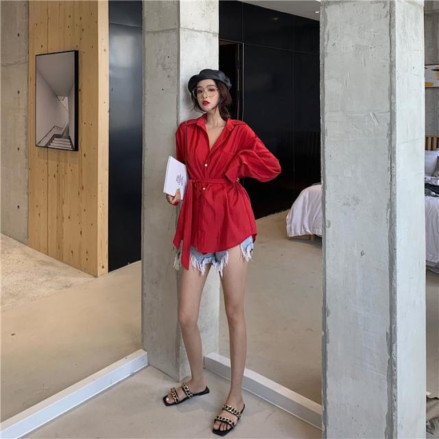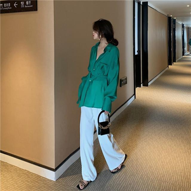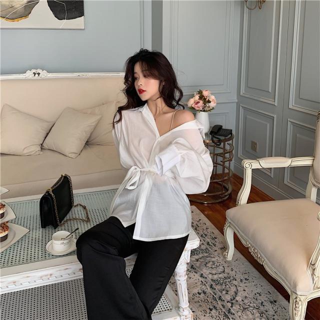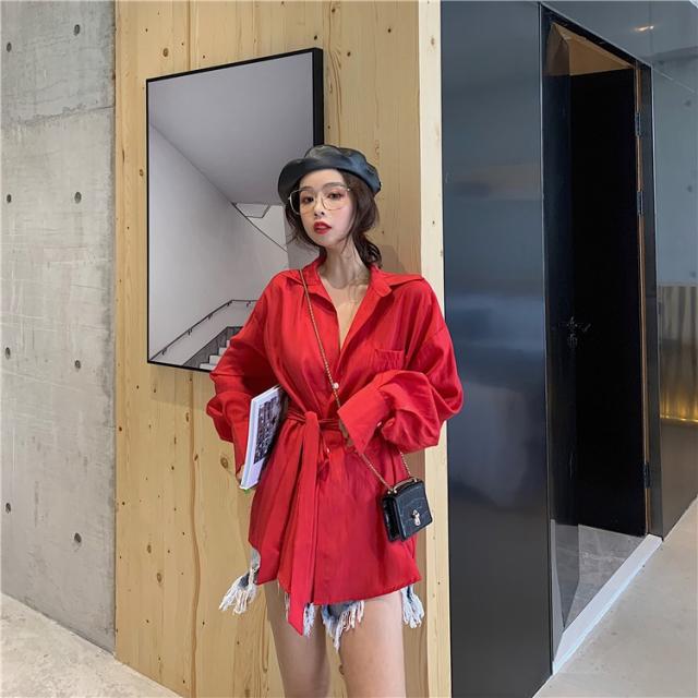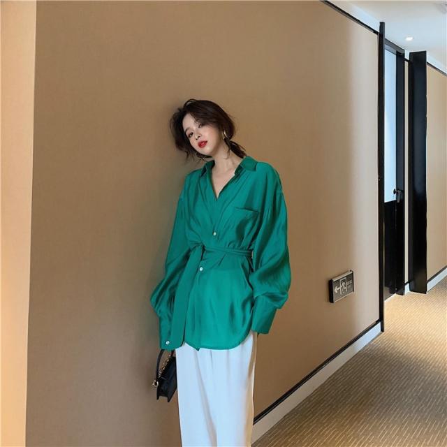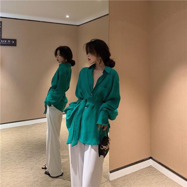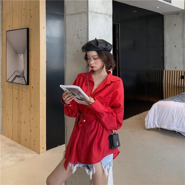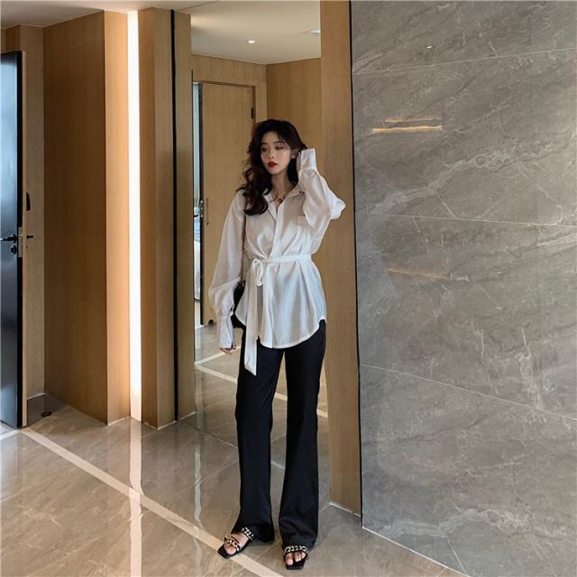 ブラウス レディース 春秋 長袖 Vネック 韓国風 オフィス 綿ブラウス ロング丈ブラウス ゆったり きれいめ ベルト おしゃれ カジュアル 新作 無地 3色