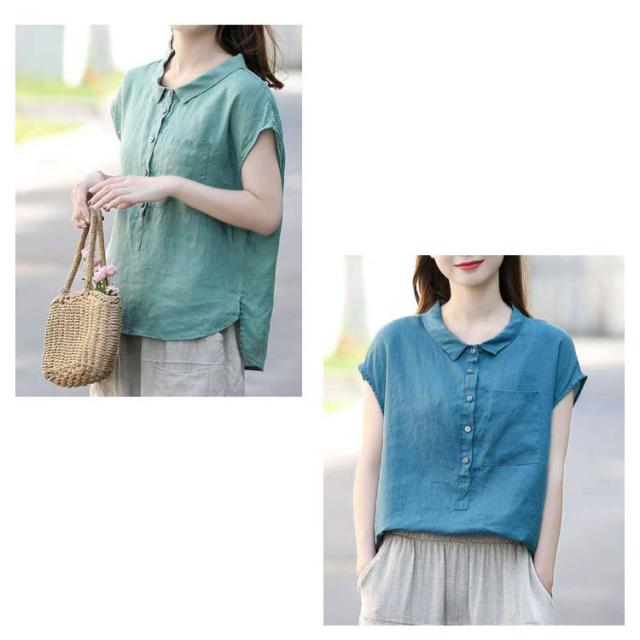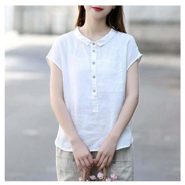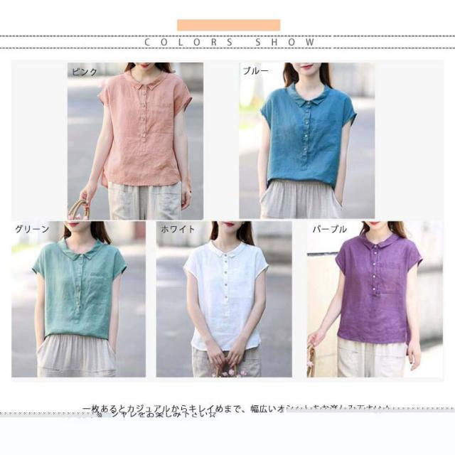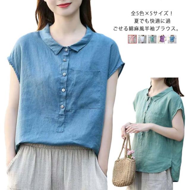 ブラウス 半袖 レディース 丸襟ブラウス トップス 半袖ブラウス プルーオーバー 綿麻風 ナチュラル カジュアル 綿 コットン シンプル 無地 春 夏 送料無料 20代 30代 40代