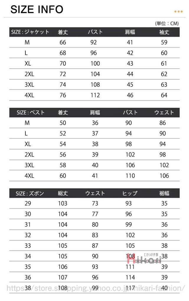 | サイズについての説明 | スーツ メンズ スリーピーススーツ ビジネススーツ ストライプ柄 上下セット 紳士服 カジュアルスーツ フォーマル 新生活※サイズは実寸法なので、多少の誤差がございます。日本サイズ表示ではありません。 日本サイズより小さめになります。正確な日本サイズへの換算が困難な為、サイズは目安としてお考え下さい。普段着より1,2サイズ上をお勧めします。お客様の「身長/体重」をご要望欄にご記入の上、注文いただければ幸いです。※記載サイズは平置き実寸になります。サイズ表記の数値に1-3cmの誤差が生じる場合がございます。※お使いの画面と実際のお色に若干の差がある場合がございます。※機械による生産過程におきまして、どうしても生地を織る際の糸の継ぎ目や多少のほつれ、または色ムラなどが生じている場合がございます。※ベルト、飾りやインナーなどは含みません。 |