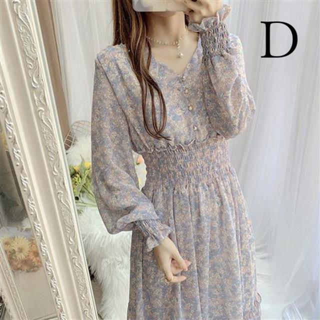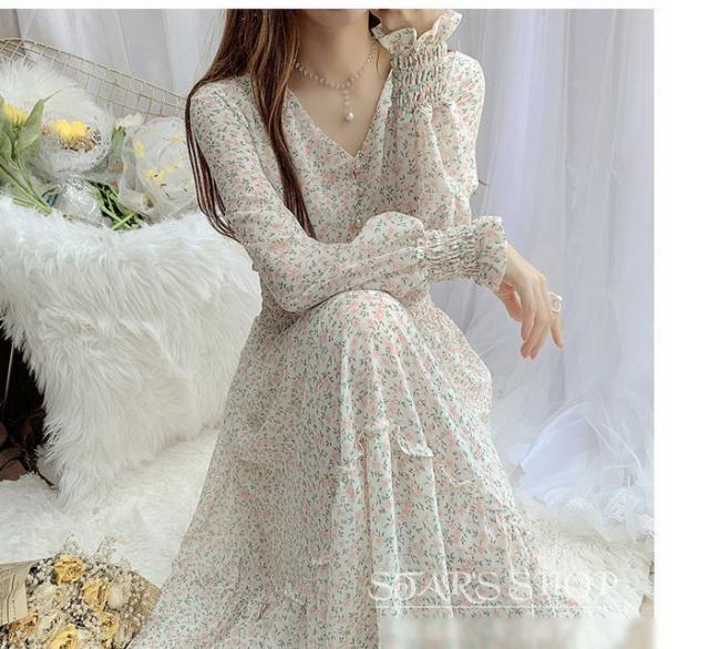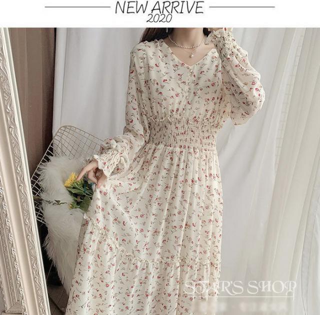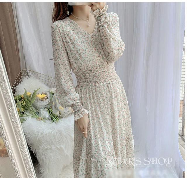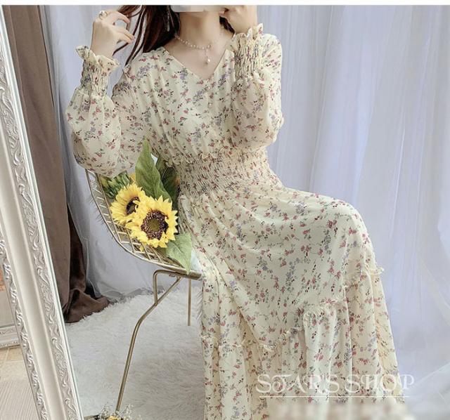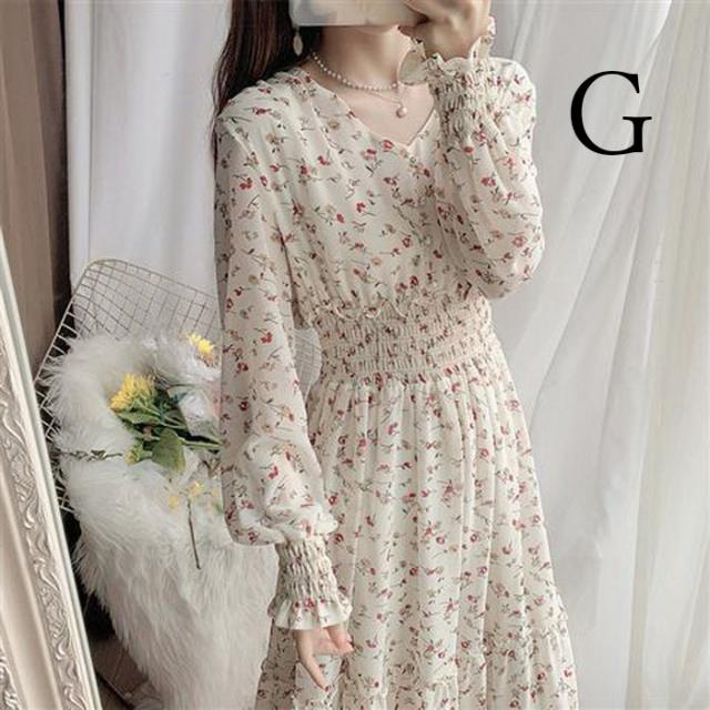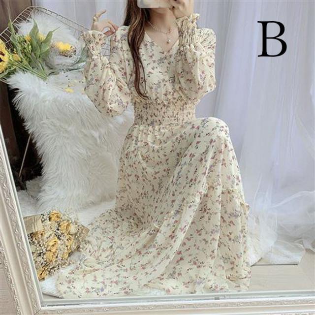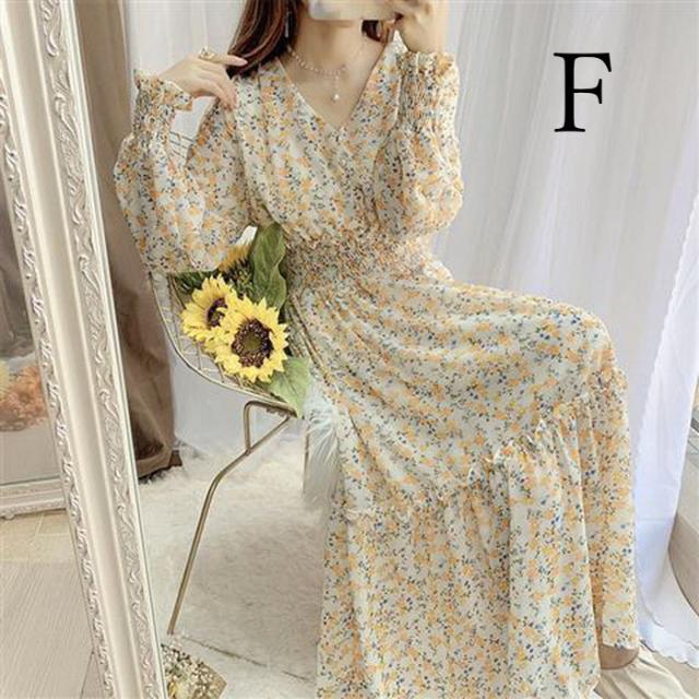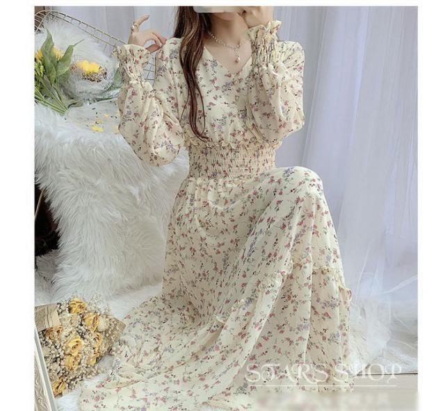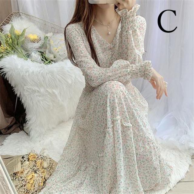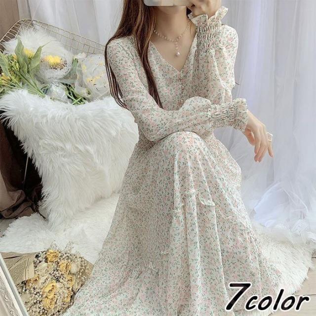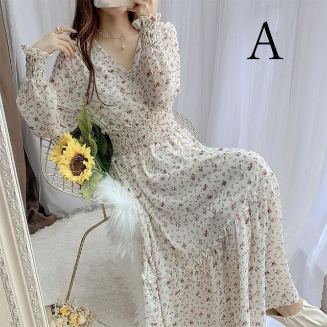 ワンピース レディース 40代マキシワンピース 春秋 長袖ワンピース vネックワンピ シフォンワンピース 花柄 フレアスカート オシャレ 結婚式 通勤 お出かけ