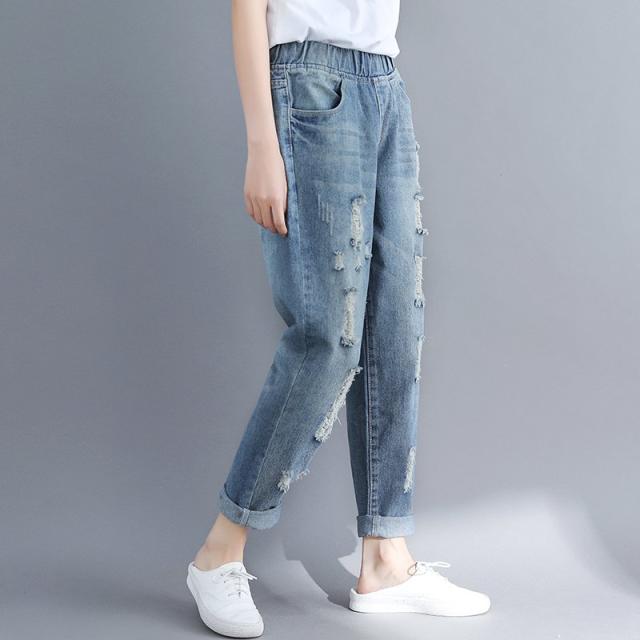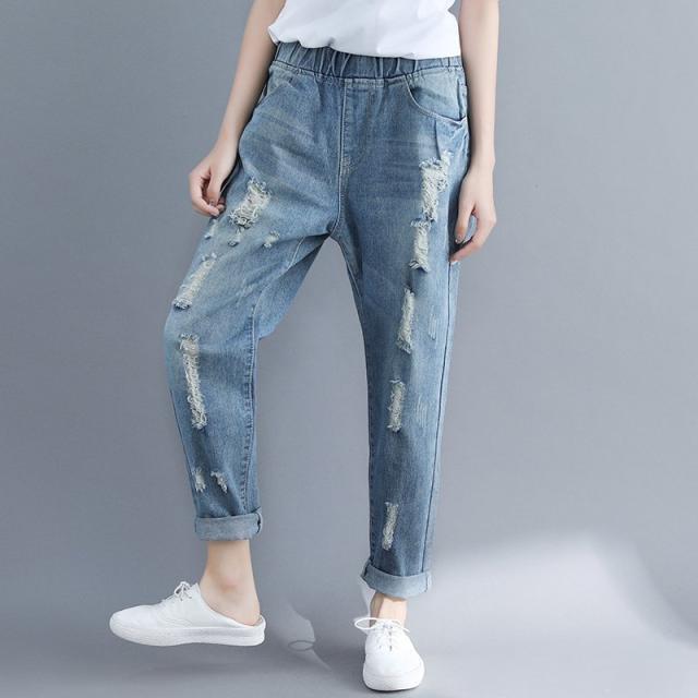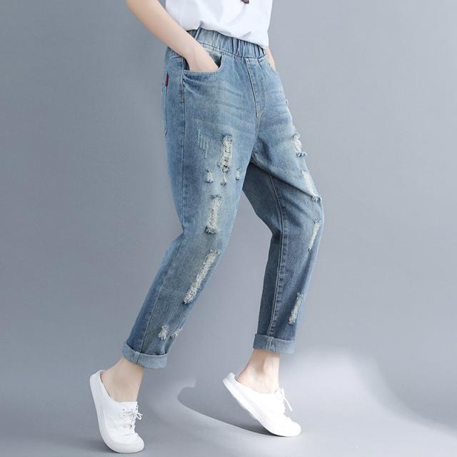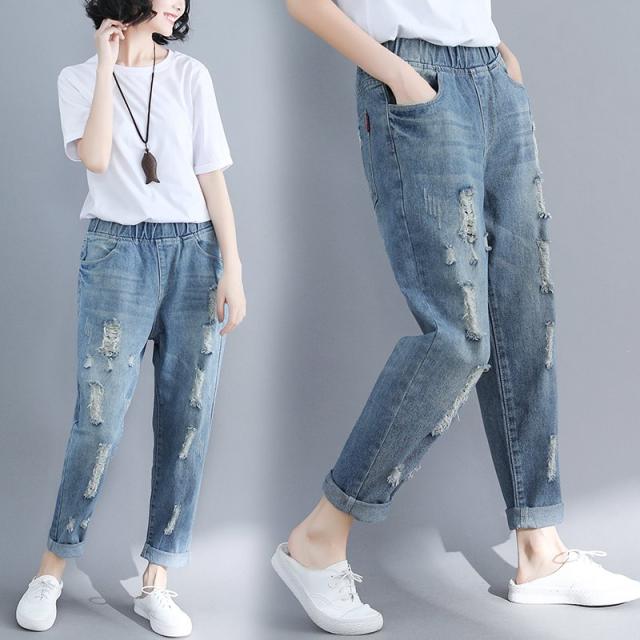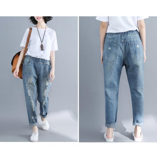 大きいサイズ M-2XL サルエルパンツ デニムパンツ ガウチョ ワイドパンツ ジーンズ ボトムス レディース ダメージ加工 ウエストゴム 個性的 九分丈パンツ