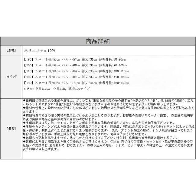 | サイズについての説明 | サイズ:【 90】スカート長/53cm バスト/57cm 袖丈/31cm 参考身長:80-90cm【100】スカート長/57cm バスト/60cm 袖丈/34cm 参考身長:90-100cm【110】スカート長/61cm バスト/64cm 袖丈/36cm 参考身長:100-110cm【120】スカート長/65cm バスト/67cm 袖丈/39cm 参考身長:110-120cm【130】スカート長/69cm バスト/71cm 袖丈/41cm 参考身長:120-130cmモデル:身長112cm 体重16kg 試着120サイズ注意事項:※ 平置き素人採寸ですので多少の誤差はご容赦下さい。※ モニタ環境によって、商品の色合いが多少違う場合があります。 |