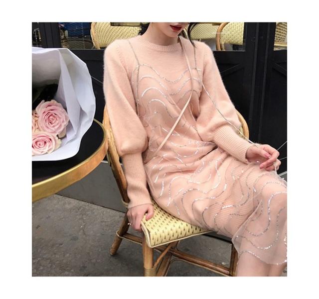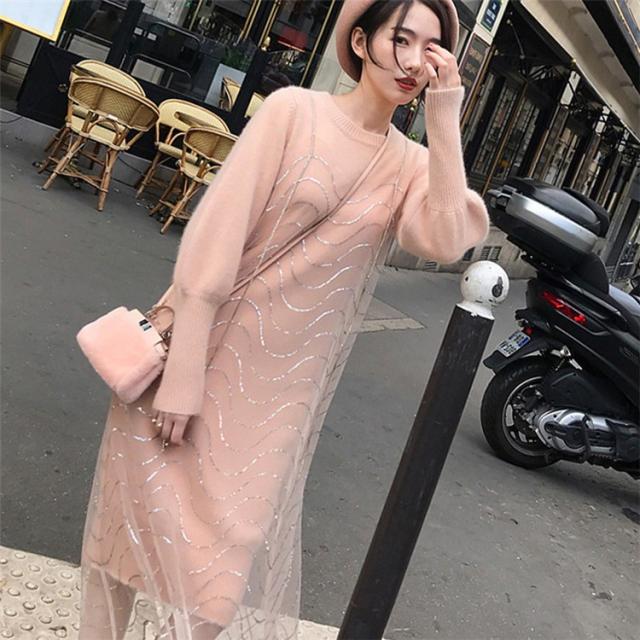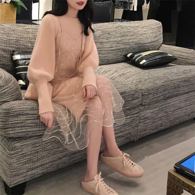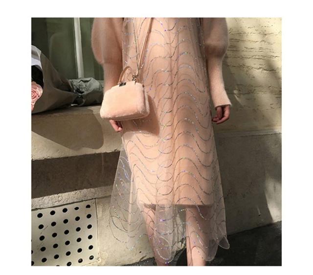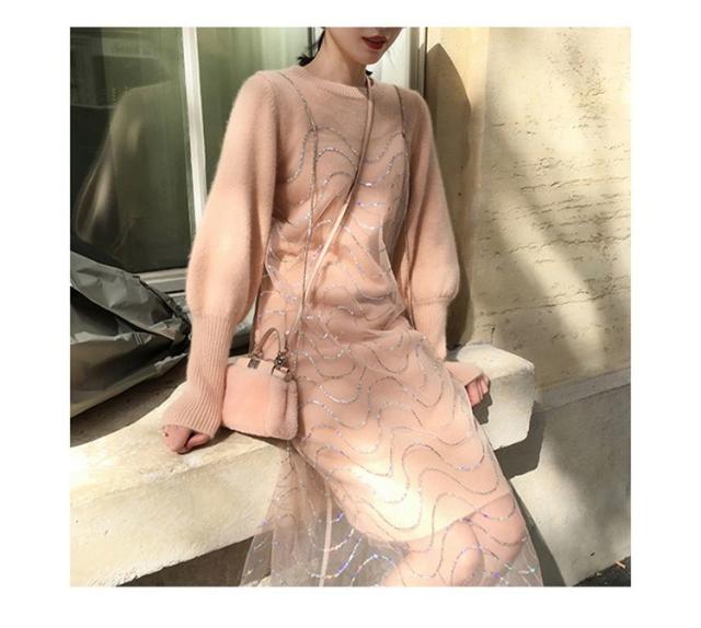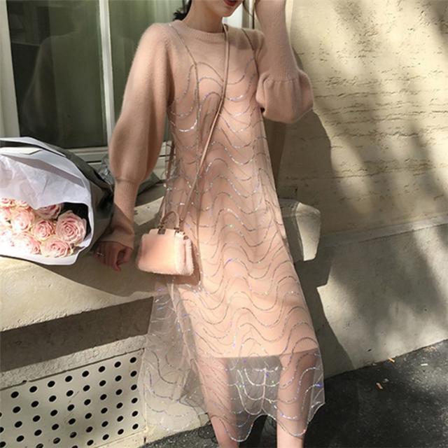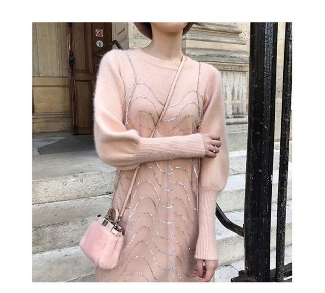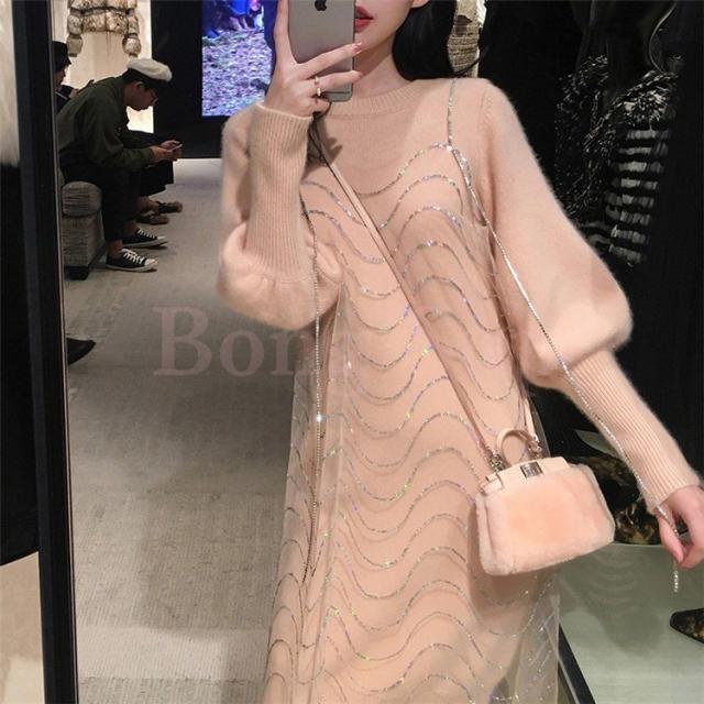 2点セット ニットワンピース レディース チュール 40代 秋冬 膝丈 モコモコ ワンピース きれいめ パフスリーブ セーター メリヤス ワンピース 長袖 体型カバー