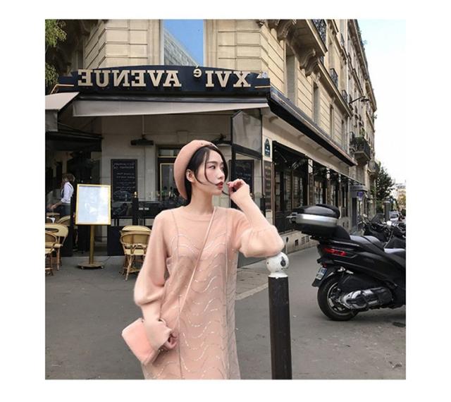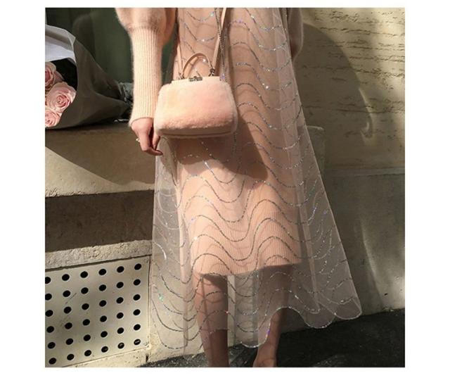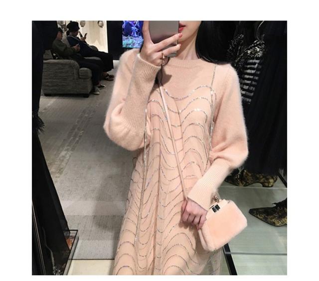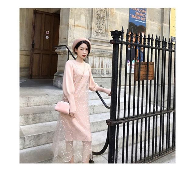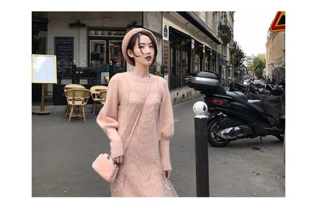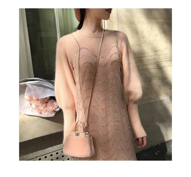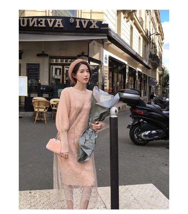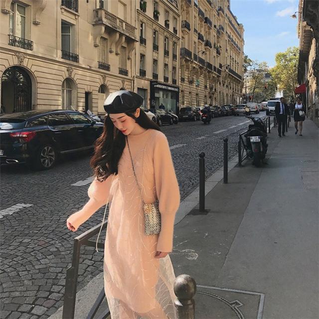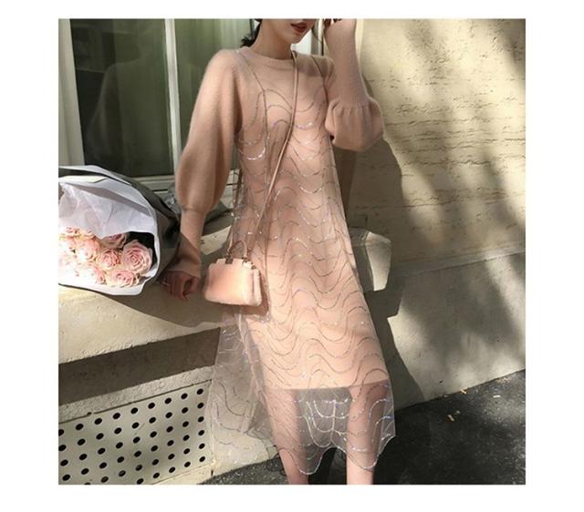 2点セット ニットワンピース レディース チュール 40代 秋冬 膝丈 モコモコ ワンピース きれいめ パフスリーブ セーター メリヤス ワンピース 長袖 体型カバー