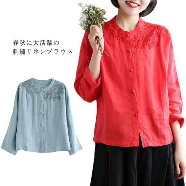 リネンシャツ リネン シャツ 刺繍 レディース 綿 麻 コットン混 リネン混 長袖シャツ シャツブラウス トップス ドロップショルダー ナチュラル 優雅 エレガント 上品 カジュアル 春秋 送料無料