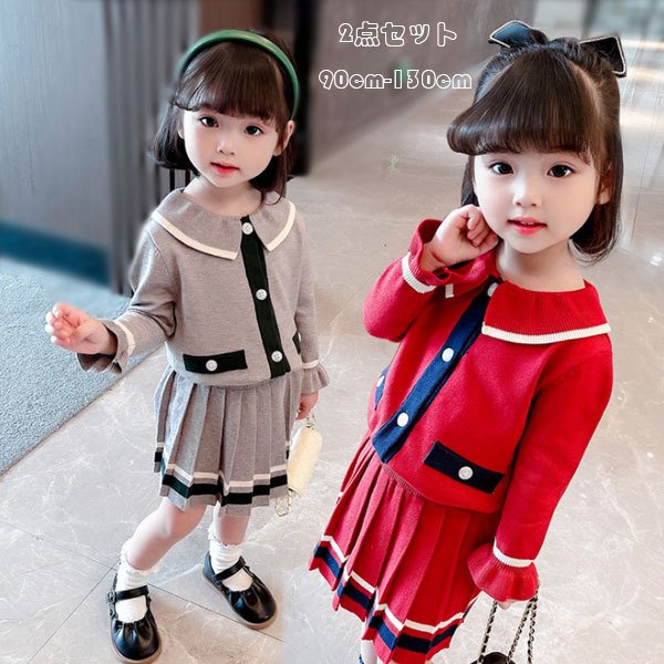 韓国子供服 ニットセット 女の子 幼児 フォーマル 結婚式 セットアップ 上下セット キッズ ベビー カーディガン+スカート 発表会 七五三 グレー レッド 90-130