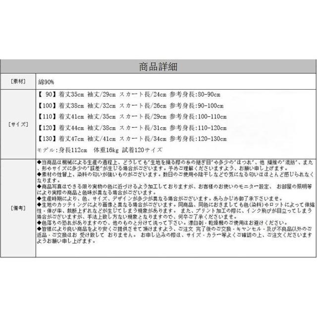 | サイズについての説明 | サイズ:【 90】着丈35cm 袖丈/29cm スカート長/24cm 参考身長:80-90cm【100】着丈38cm 袖丈/32cm スカート長/26cm 参考身長:90-100cm【110】着丈41cm 袖丈/35cm スカート長/29cm 参考身長:100-110cm【120】着丈44cm 袖丈/38cm スカート長/31cm 参考身長:110-120cm【130】着丈47cm 袖丈/41cm スカート長/34cm 参考身長:120-130cmモデル:身長112cm 体重16kg 試着120サイズ注意事項:※ 平置き素人採寸ですので多少の誤差はご容赦下さい。※ モニタ環境によって、商品の色合いが多少違う場合があります。 |