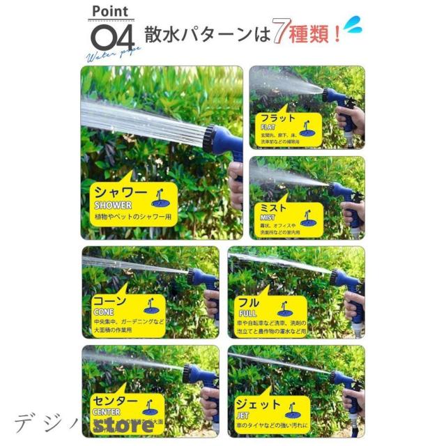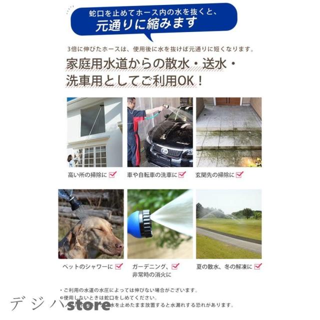 | サイズについての説明 | 商品情報伸びるホース 3倍に伸びる 5m-15m ノズル付き 伸縮ホース 魔法のホース 散水ホース マジックホース 改良版 おしゃれ 軽い 軽量 コンパクト 絡まない 水撒き 散水用具 洗車用品 掃除用具 便利グッズ ベランダ 廊下 庭 大掃除 ガーデニング 農業 農作業 多機能 ホース【商品説明】★水を通すと3倍に伸びる★柔らかでコンパクトに収納できる★軽くて持ち運びも便利★水道蛇口への取り付けが簡単★7種類の散水パターンは様々なシーンで活用できる※サイズ表記は目安です。誤差はご了承ください。※生産の関係により写真と色、柄が若干異なる場合があります。※商品は縫製上の細かいほつれ、汚れ、素材特有の臭いや接着剤等の臭いが残っている場合がございますので、気になるお客様はご購入をお控え下さい。ホース長さ:5m-15m商品説明 |