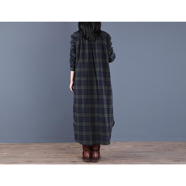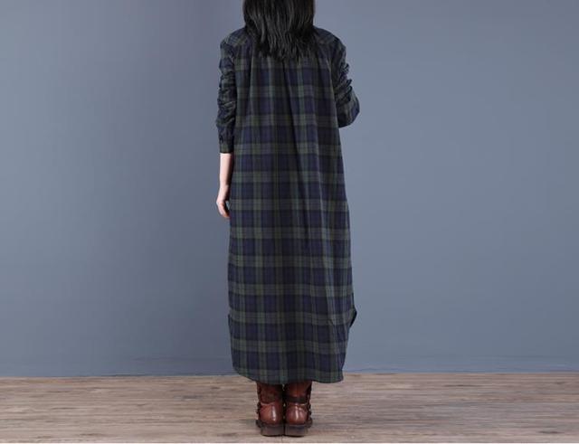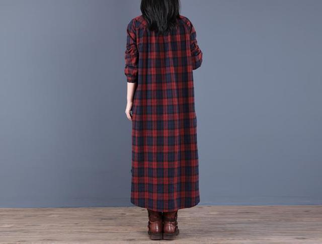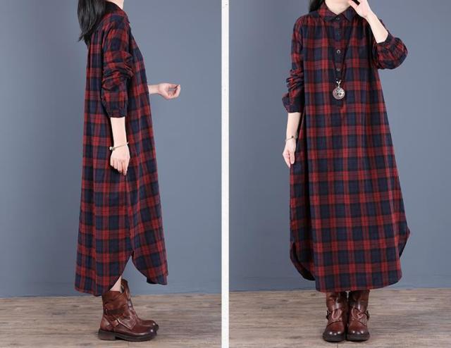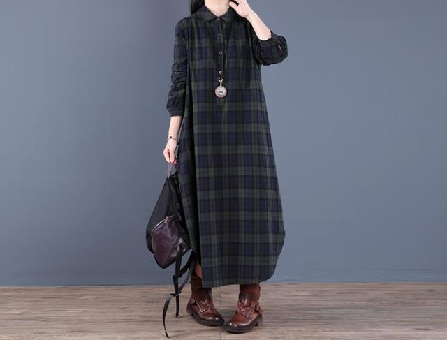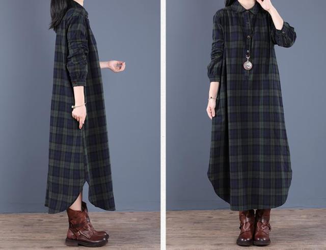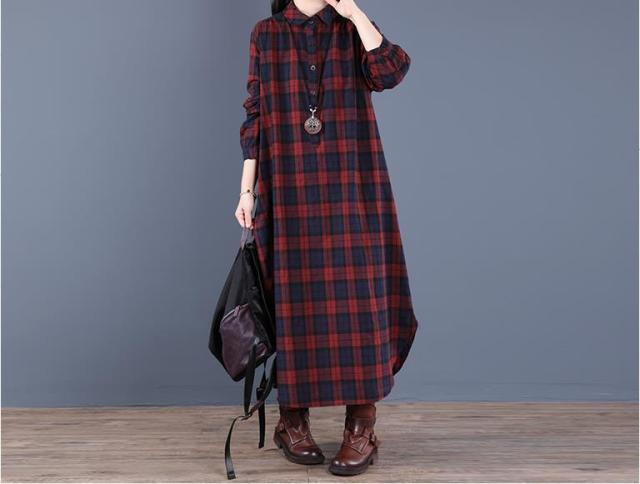 ワンピース レディース シャツワンピース 綿麻風ワンピース ロング丈 長袖 チェック柄 体型カバー 大きいサイズ ゆったり 着痩せ 秋 30代 40代 50代