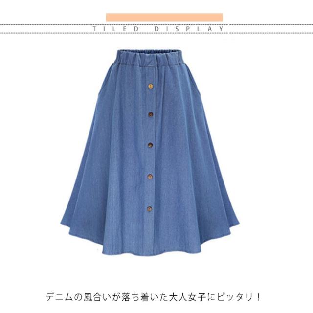| ミディアム丈 デニム フレアスカート ガーリーなデザインのフレアスカート。 デニムの風合いが落ち着いた大人女子にピッタリ! 動きのあるシルエットも魅力。 スタイルアップ効果抜群のアイテムです。 ナチュラルなフェイクボタンがコーデのアクセントに♪ | |