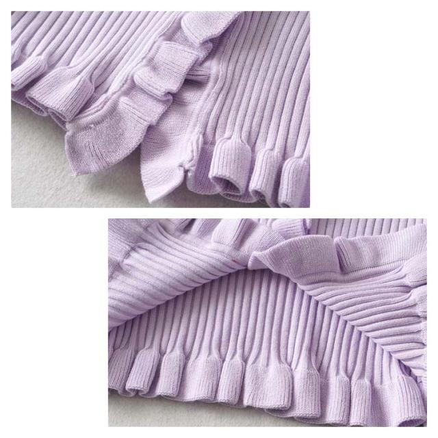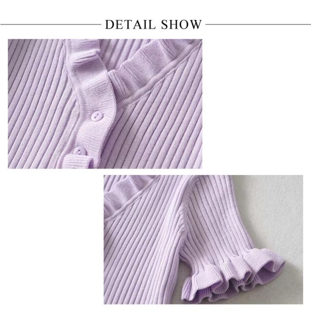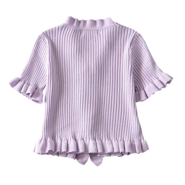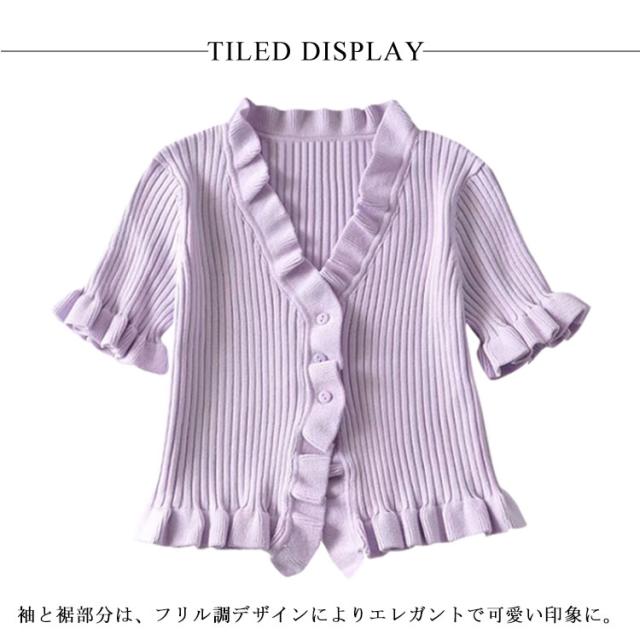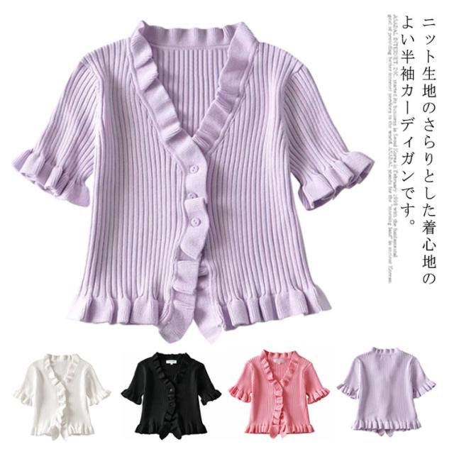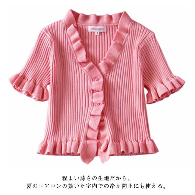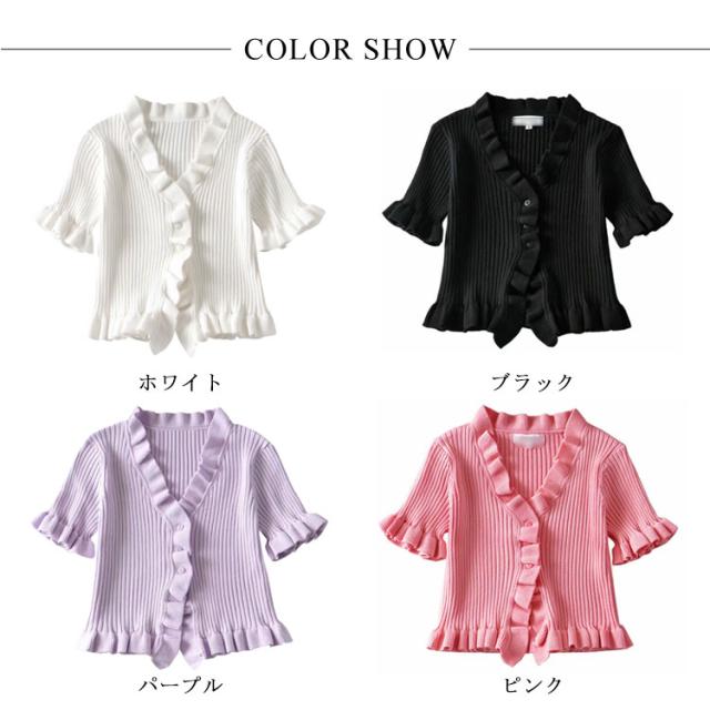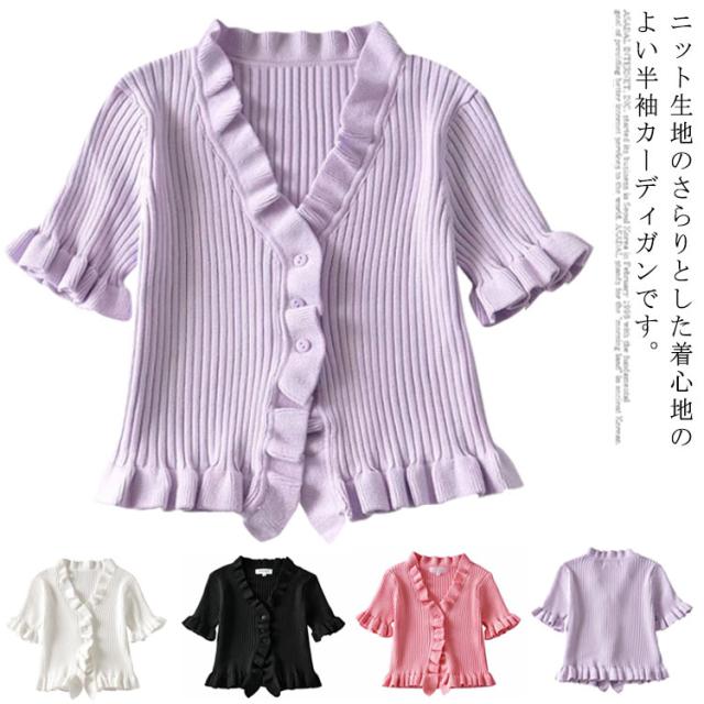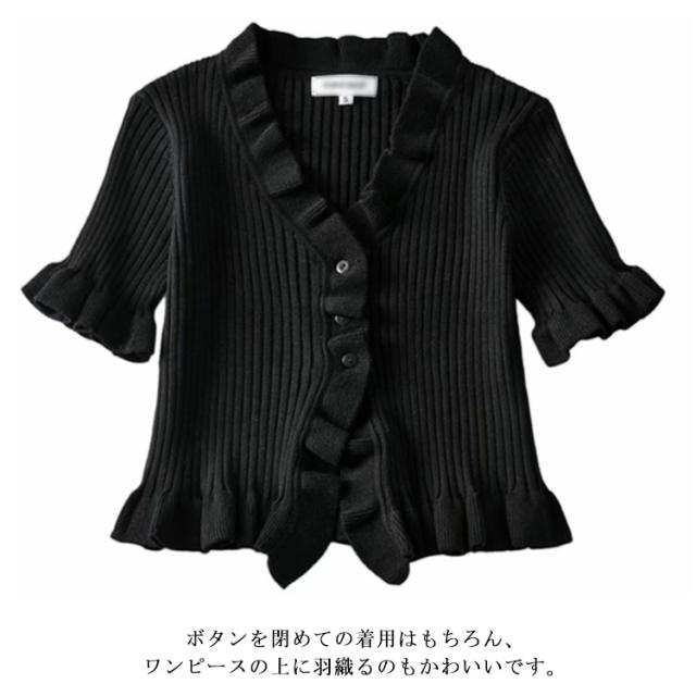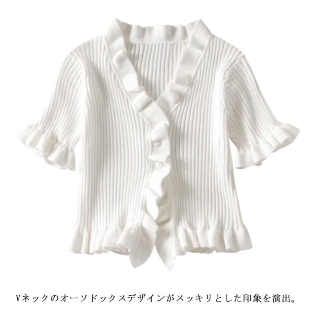 ニットカットソー カーディガン ブラウス レディース 半袖 vネック ショート丈 フリル 無地 きれいめ 春 夏 トップス おしゃれ かわいい カジュアル 通勤 通学 上品 ファッション 20代 30代