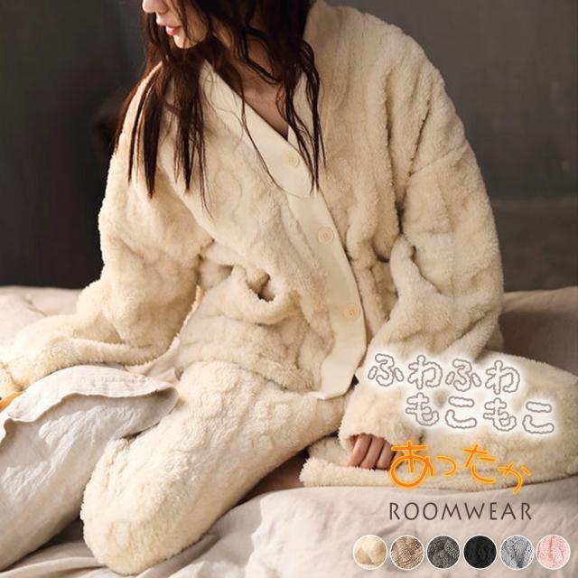 春新作 ルームウェア レディース 長袖 冬 可愛い ふんわり もこもこ ボア 防寒 保温 トップス パンツ 上下セット セットアップ 2点セット パジャマ 部屋着 ゆったり 前開き 起毛 ロングパンツ ドロップショルダー 伸縮性 ストレッチ 無地