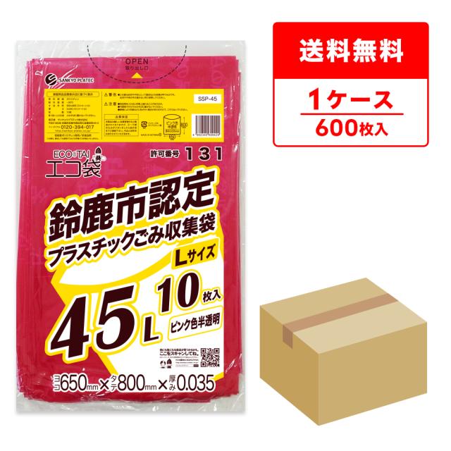 SSP-45 鈴鹿市指定袋 プラスチックごみ用 45リットル Lサイズ 0.035mm厚 ピンク色半透明 10枚x60冊/ ゴミ袋 ごみ袋 送料無料