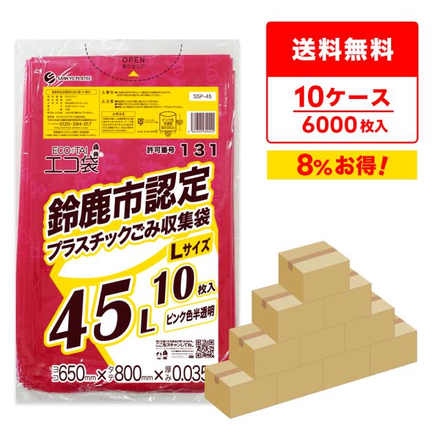 【まとめて10ケース】SSP-45-10 鈴鹿市指定袋 プラスチックごみ用 45リットル Lサイズ 0.035mm厚 ピンク色半透明 10枚x60冊x10箱/ ゴミ袋 ごみ 送料無料