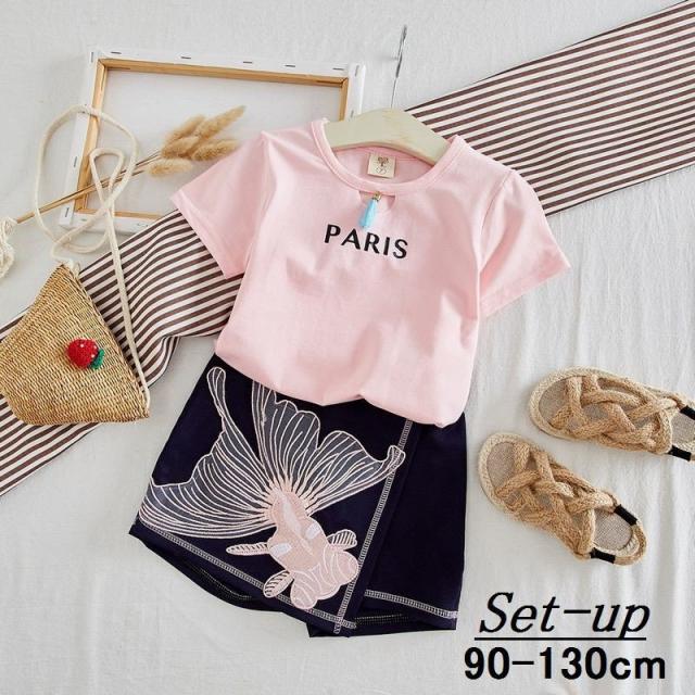 セットアップ キッズ ベビー 女の子 上下セット Tシャツ カットソー 半袖 ショートパンツ 半ズボン 2点セット トップス ボトムス 巻きスカート風