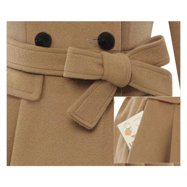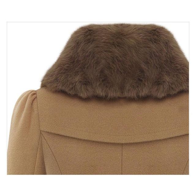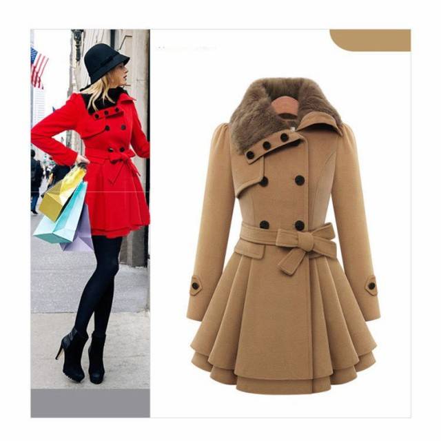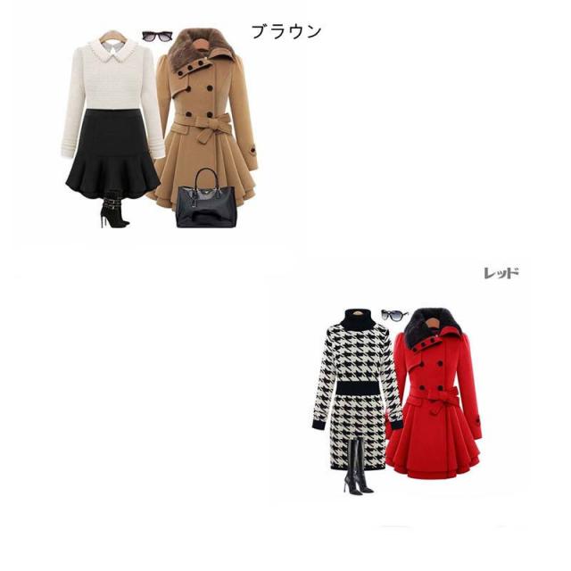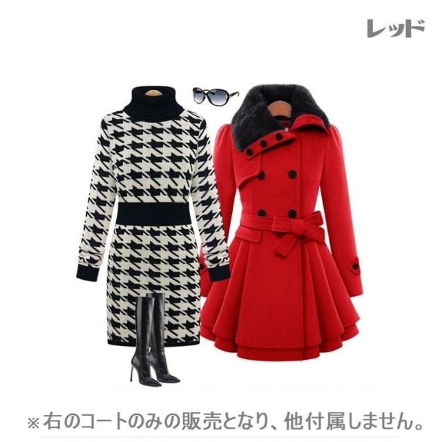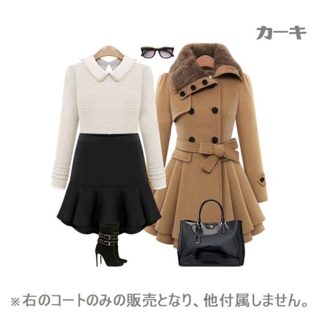 コート レディース 襟ファー フレア ミニスカート ウエストベルト リボン タイト スリム オーバーショルダー おしゃれ かわいい カーキ レッド き