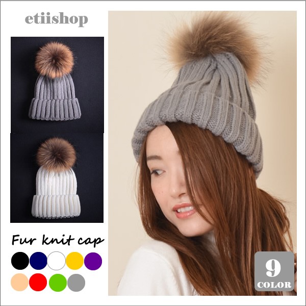 ラクーンファーポンポン付き ざっくり ニット帽 帽子 全9色