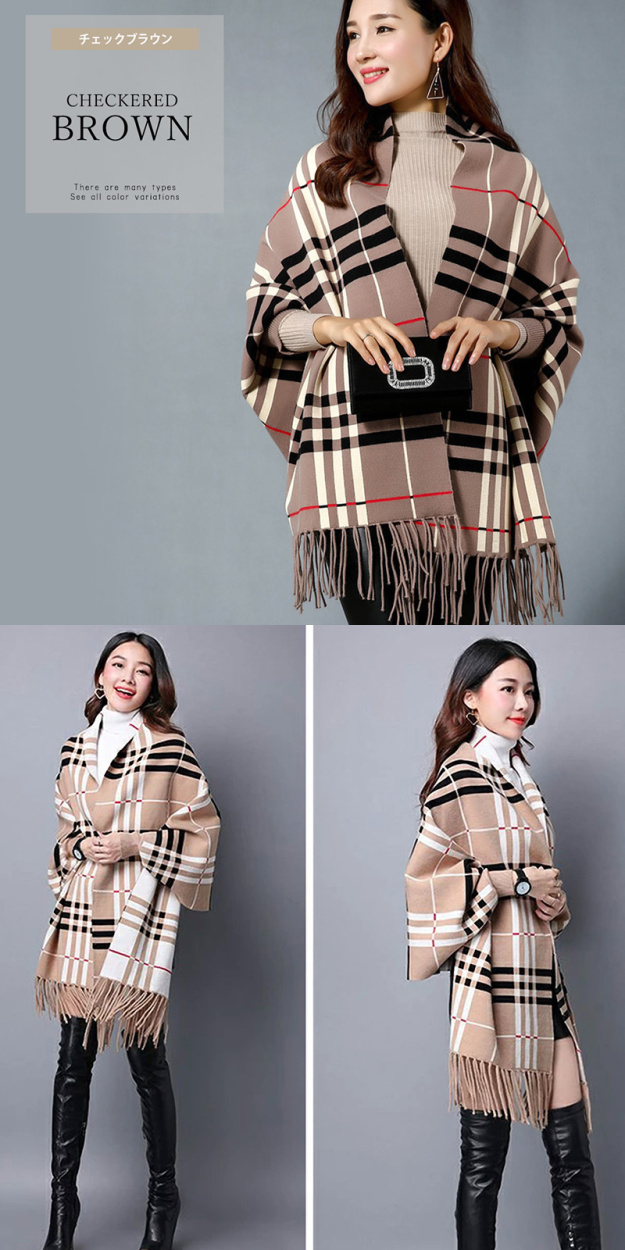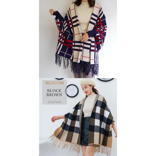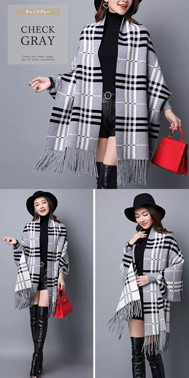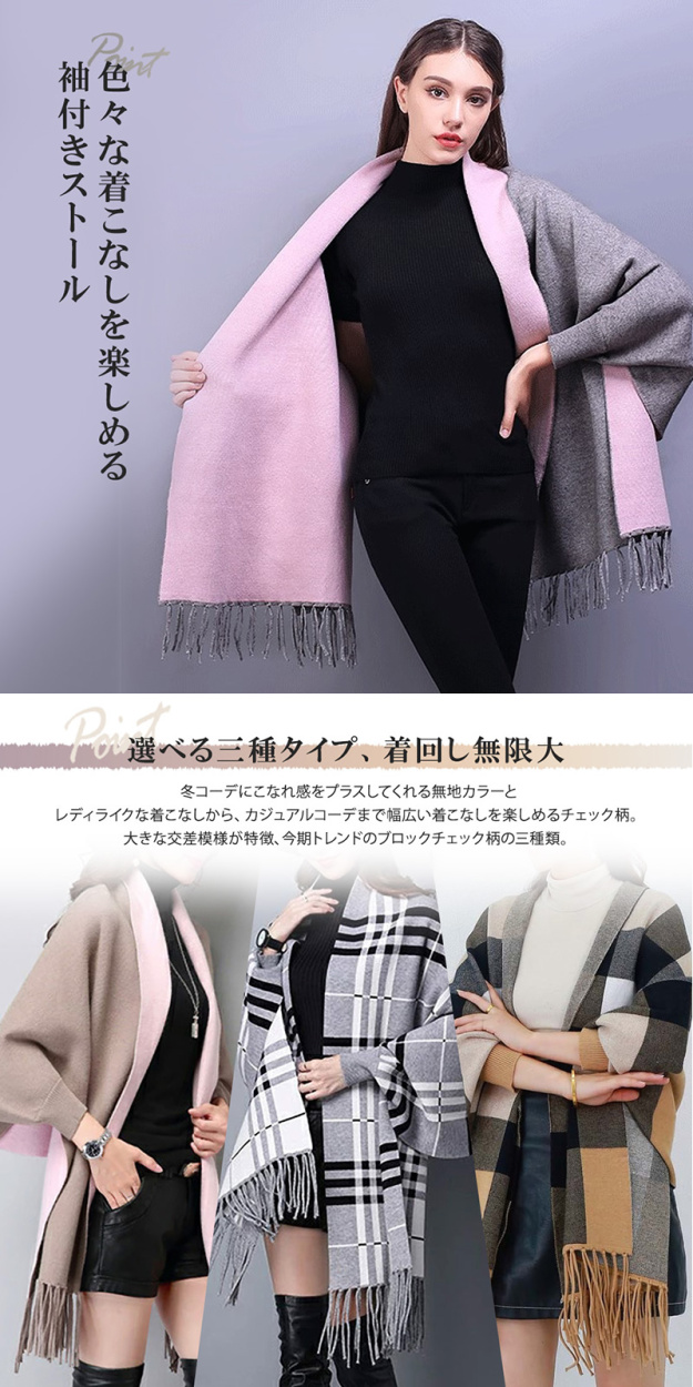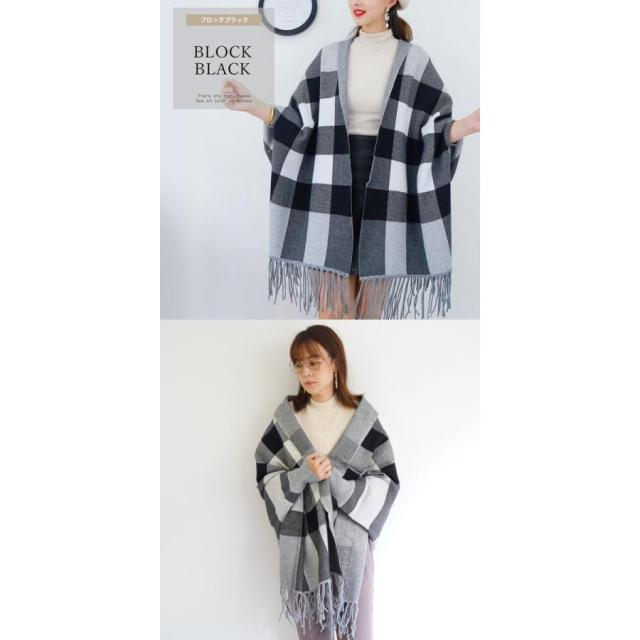 ストール 風カーディガン レディース ストール カーディガン 着る ストール ロング 袖付き 大判 ショール チェック 羽織 マフラー ポンチョ 黒 ブラック