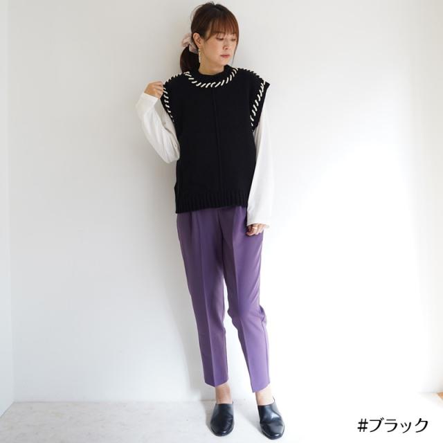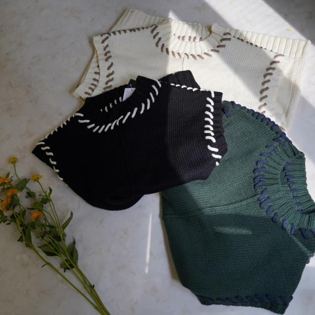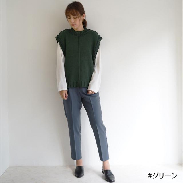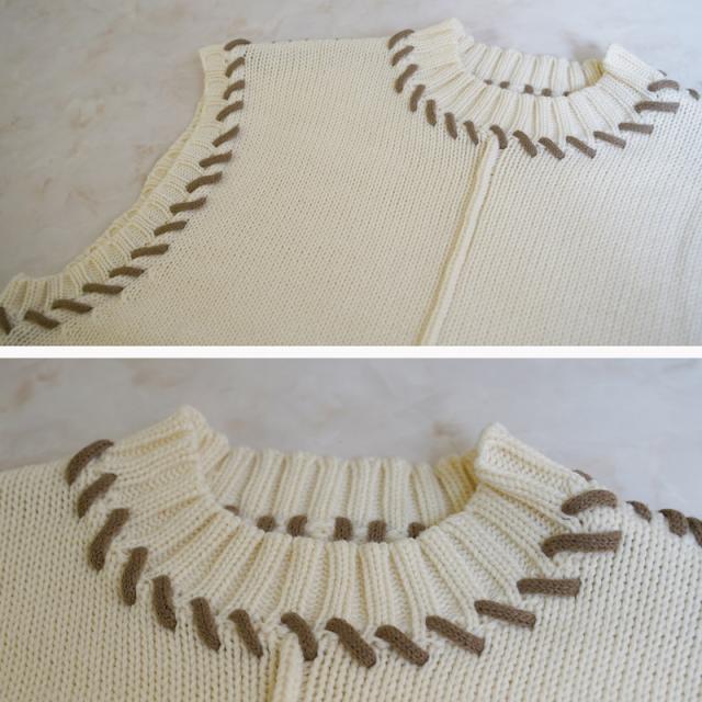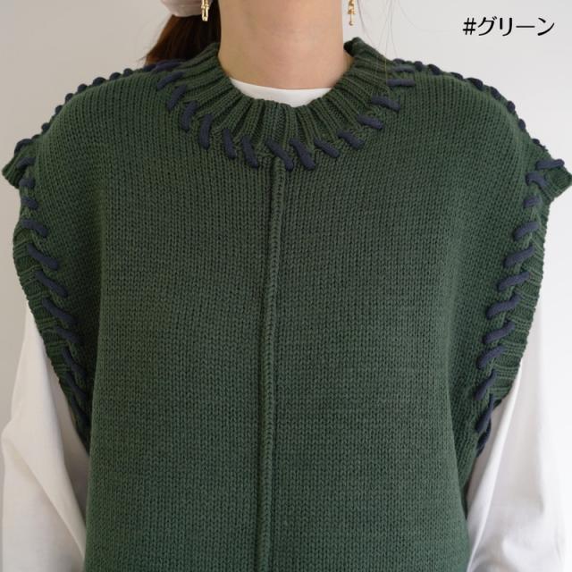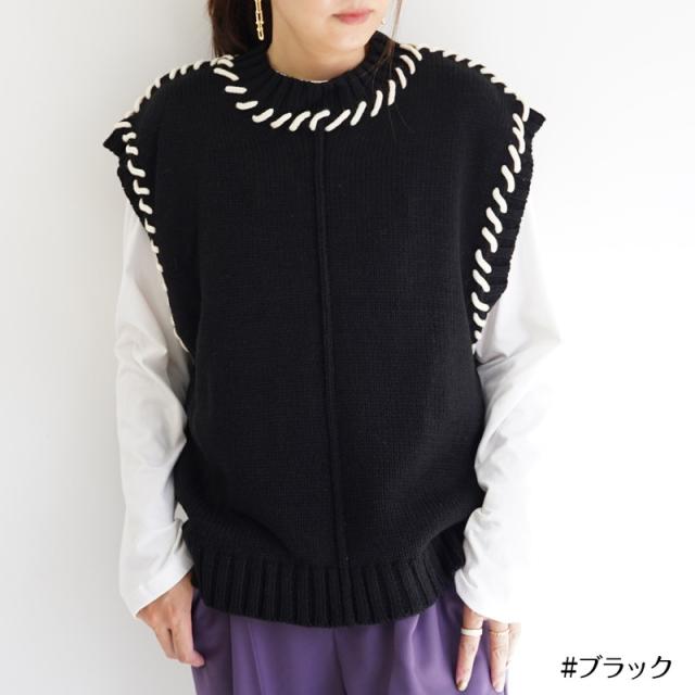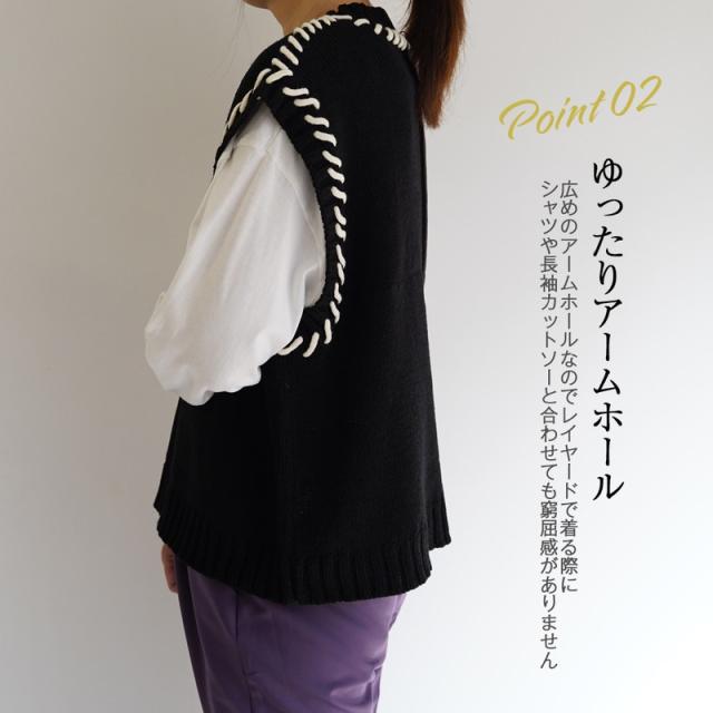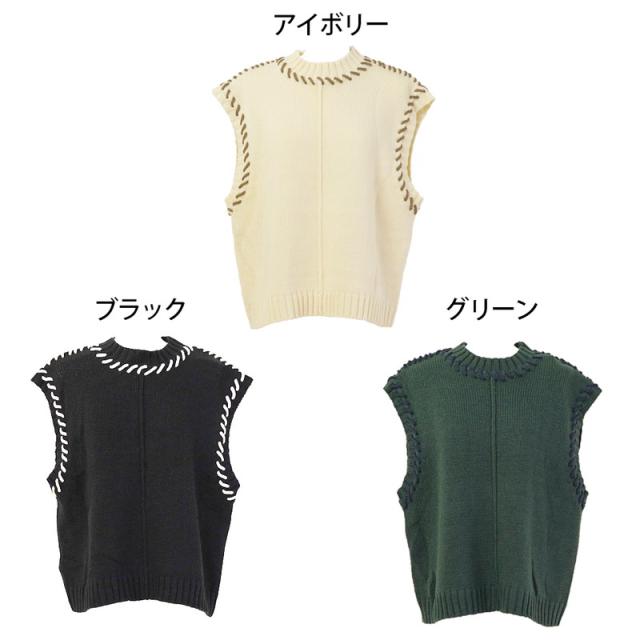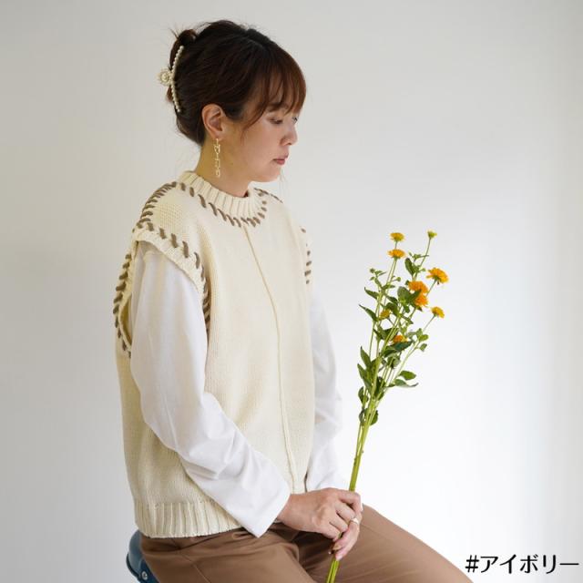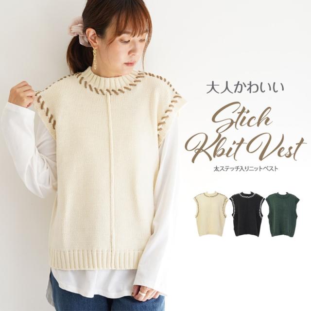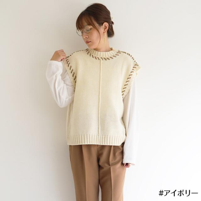 ニットベスト レディース ロング 大きいサイズ 秋 秋冬 ステッチ ハンドステッチ ジレ バイカラー おしゃれ べスト ニット オーバー ケーブルベスト