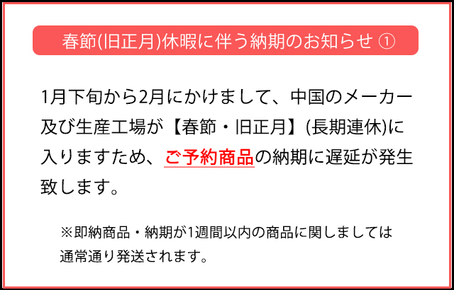 土日祝日は休業日です。お問合せのご返答及び、ご注文確定・発送は休業日明けから順次ご対応いたします。