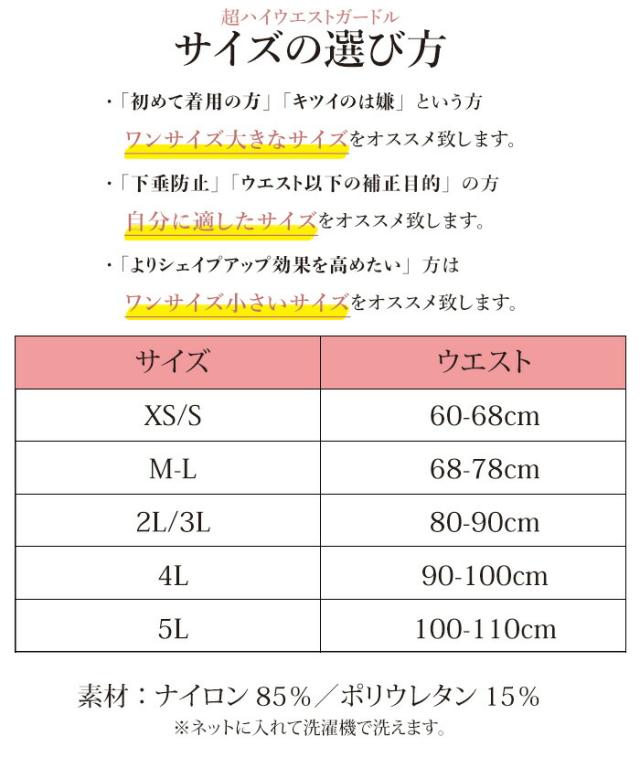 | XS-S:ウエスト60-68cm M-L:ウエスト68-78cm 2L-3L:ウエスト80-90cm 4L:ウエスト90-100cm 5L:ウエスト100-110cm ※平置き実寸サイズとなります為、若干の誤差が生じる場合がございます。 |