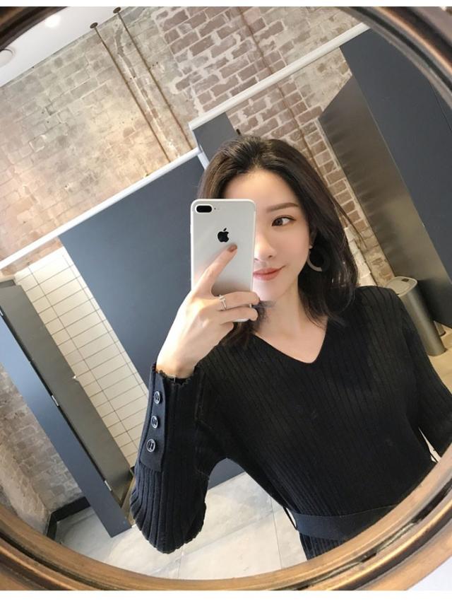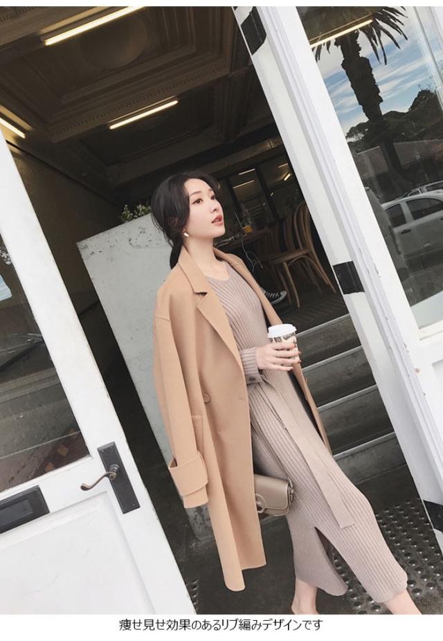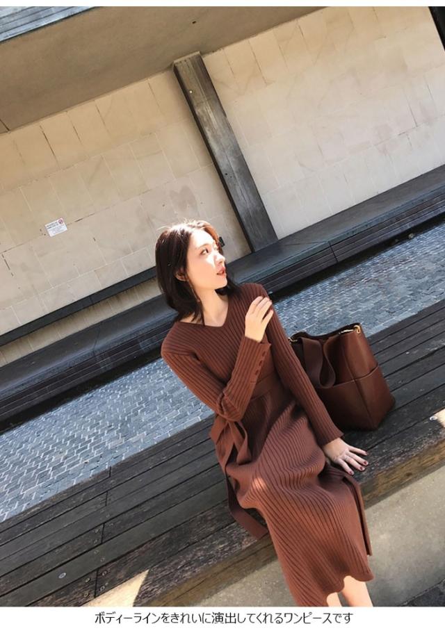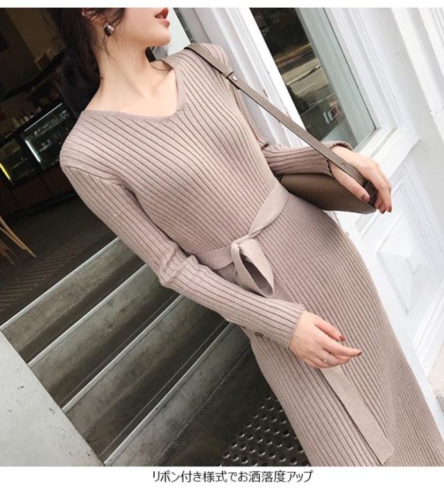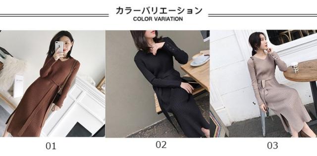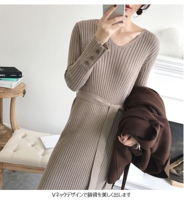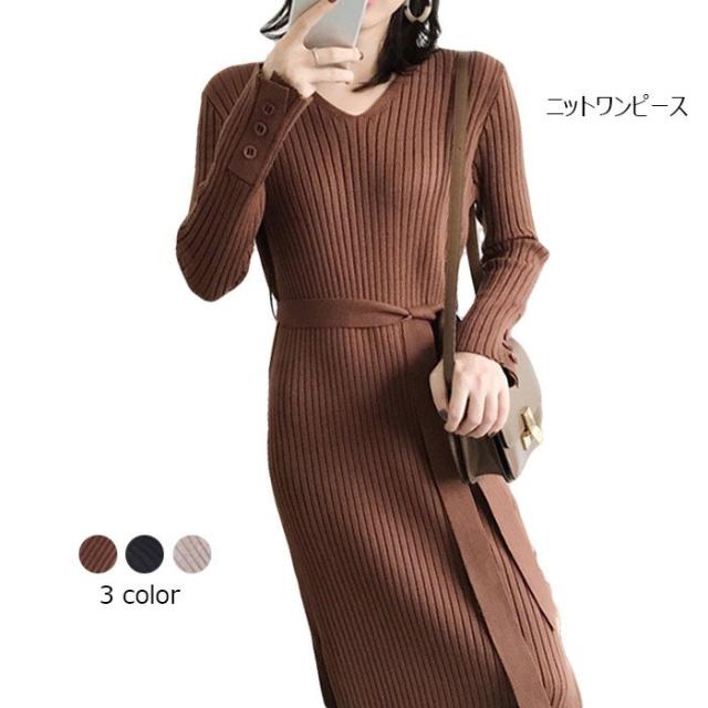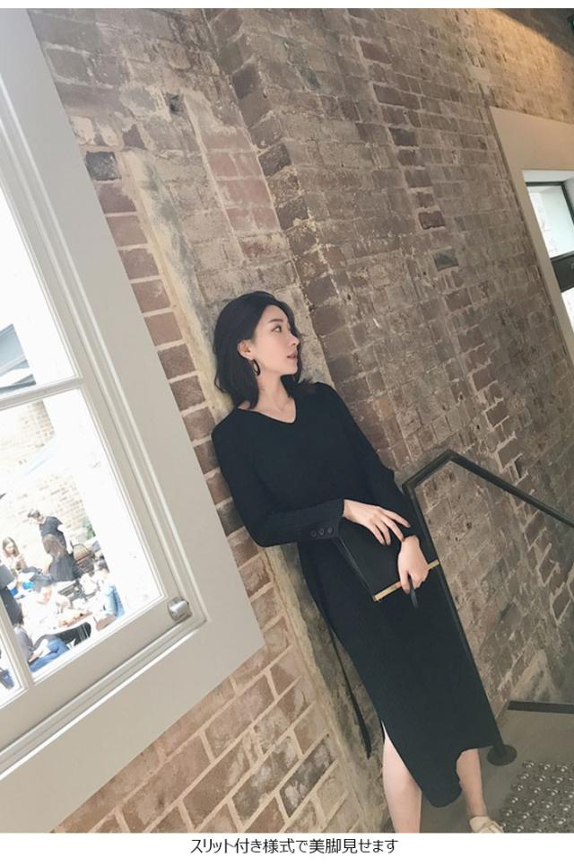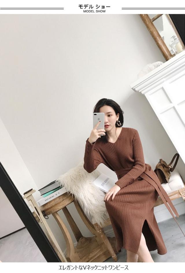 ニットワンピース レディース ミモレ丈ワンピース リブニット 長袖 Vネック 鎖骨見せ スリット 無地 シンプル 上品 こなれ感 エレガント 秋新作
